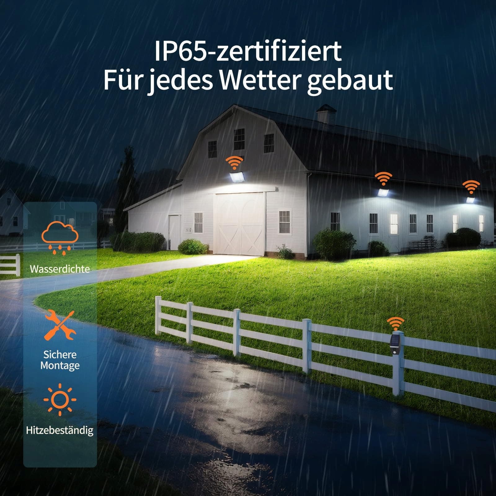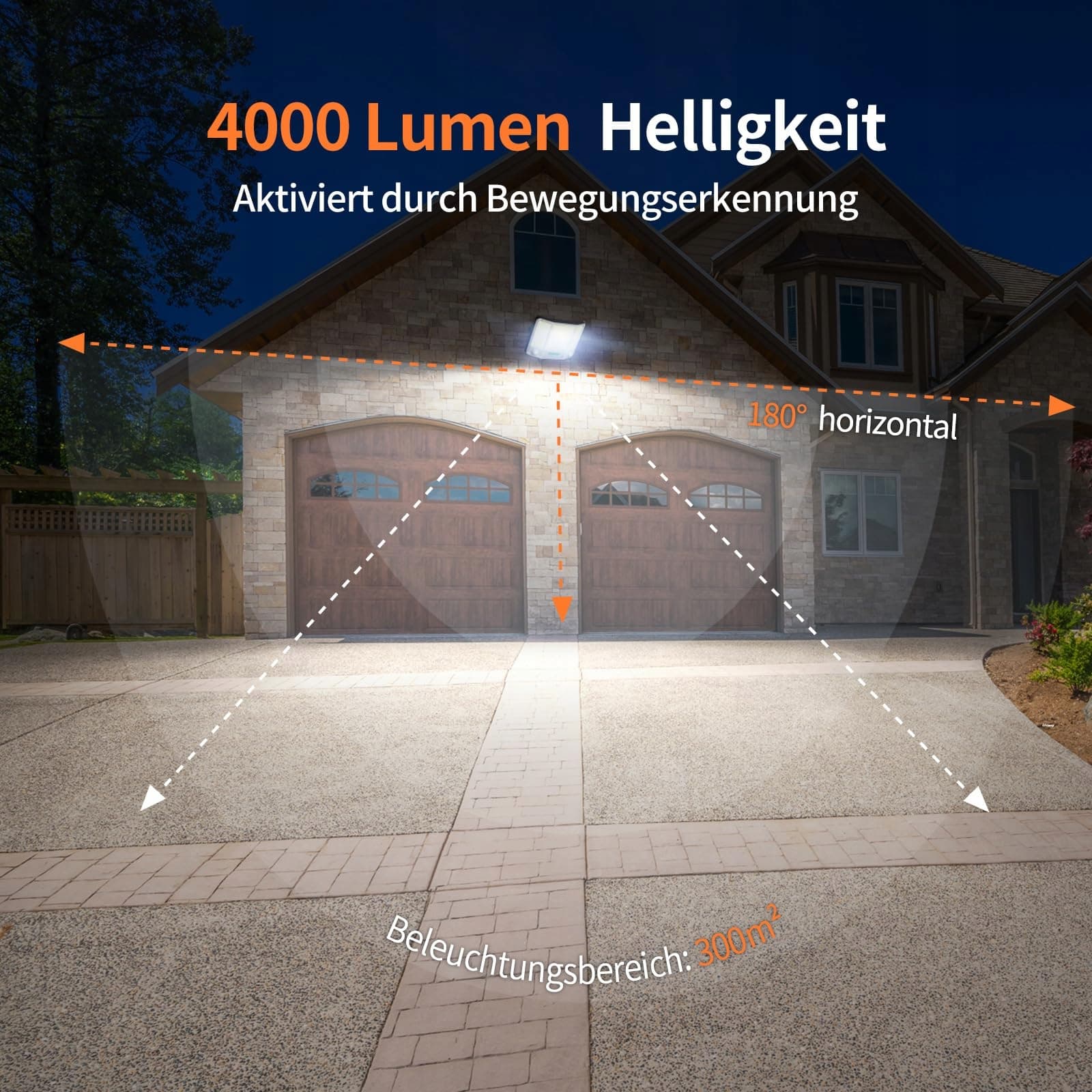 【Ultra jasny reflektor solarny na zewnątrz】 Ta lampa solarna posiada trzy panele świetlne i oferuje oświetlenie o kącie 180°. Z 210 wysoko wydajnymi diodami LED osiąga w trybie czujnika jasność do 4000 lumenów (co odpowiada żarówce o mocy 300 W). W trybie ciągłego światła jasność wynosi 1600 lumenów – wystarczająco, aby oświetlić cały podwórko przez całą noc. Zimą lub w pochmurne dni zalecany jest tryb czujnika, aby wydłużyć czas świecenia.