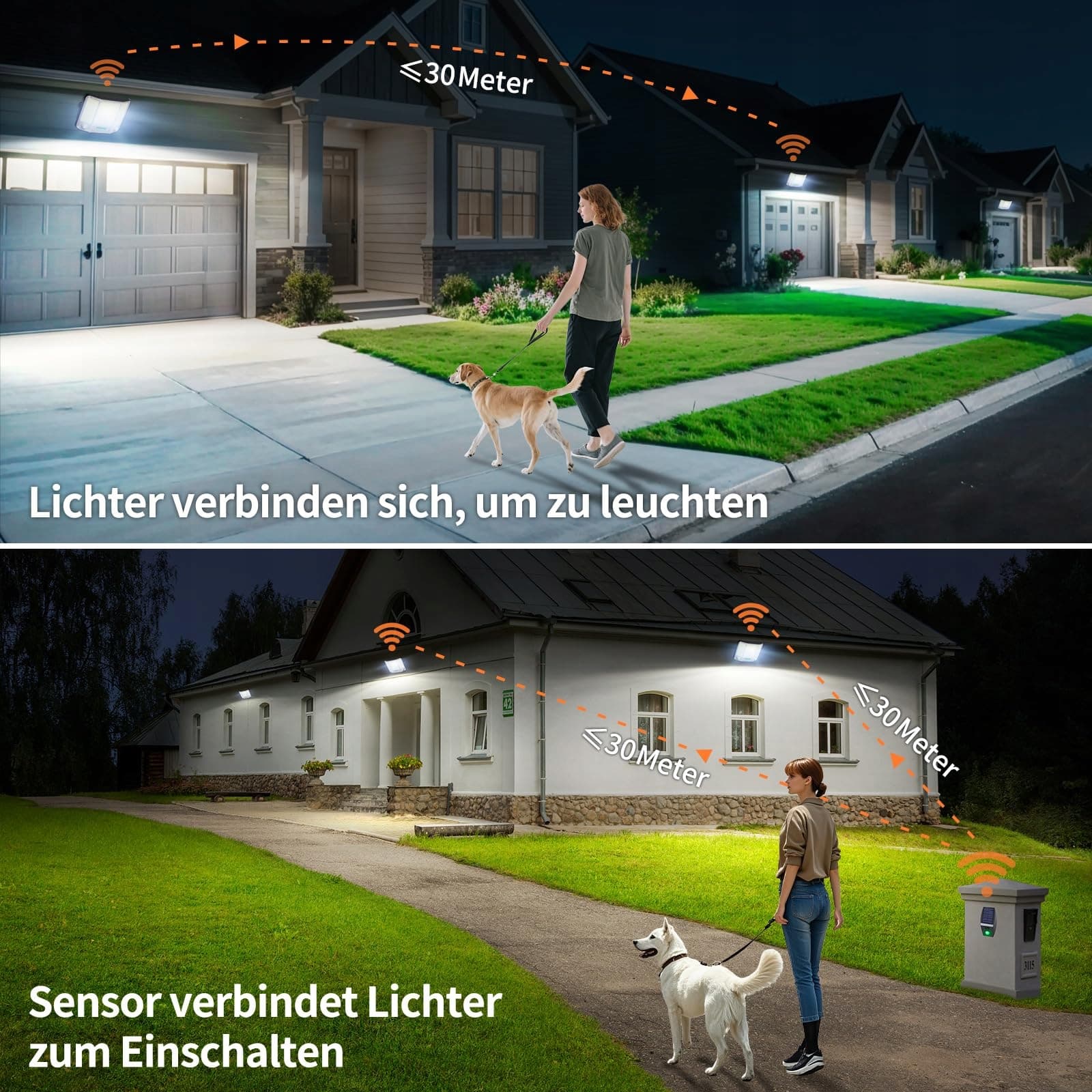 【Lampy solarne z możliwością synchronizacji】 Z pilotem zdalnego czujnika, który umożliwia zasięg wykrywania do 25 metrów. Gdy czujnik jest zainstalowany przy wejściu na podwórko, a lampa wewnątrz, światło włącza się automatycznie, gdy wykryje ruch – nawet zanim dotrzesz. Kilka lamp Intelamp można zsynchronizować dla skoordynowanego oświetlenia.