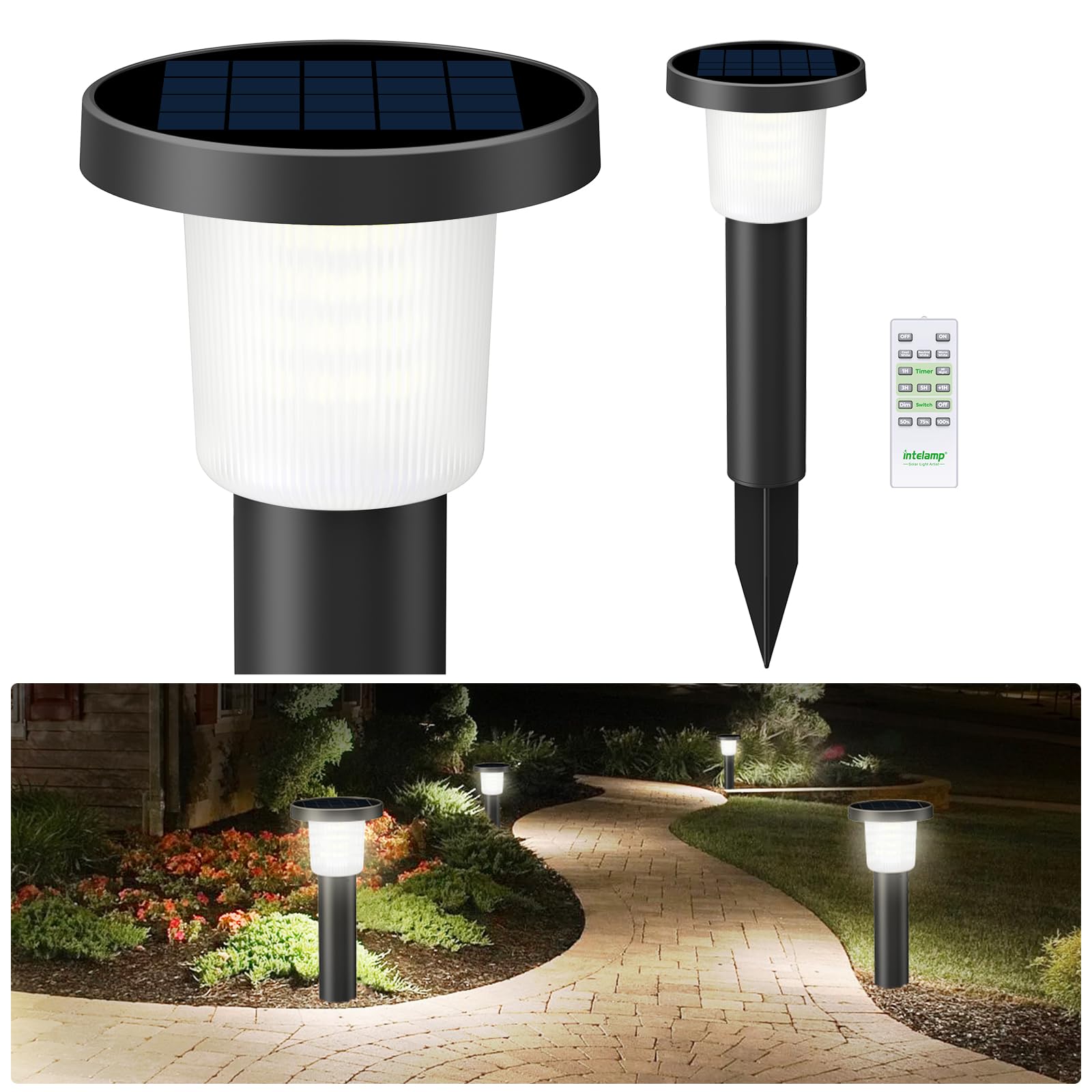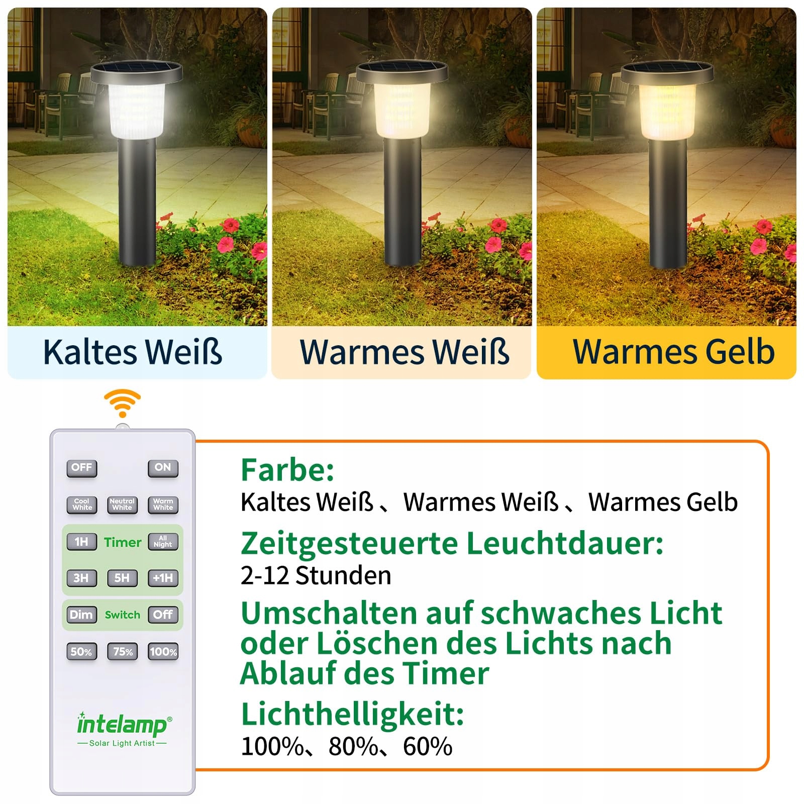 Lampy solarne do ogrodu na zewnątrz - intelamp solarne lampy ścieżkowe na zewnątrz z kolcem do ziemi wyposażone są w 64 wysoko wydajne diody LED i oferują 30% więcej jasności. Za pomocą dołączonego pilota można wygodnie ustawić timer i zmieniać trzy kolory światła (3000K/4500K/6000K) w zależności od potrzeb. Idealne rozwiązanie do stylowego i elastycznego oświetlenia zewnętrznego ścieżek i ogrodów.