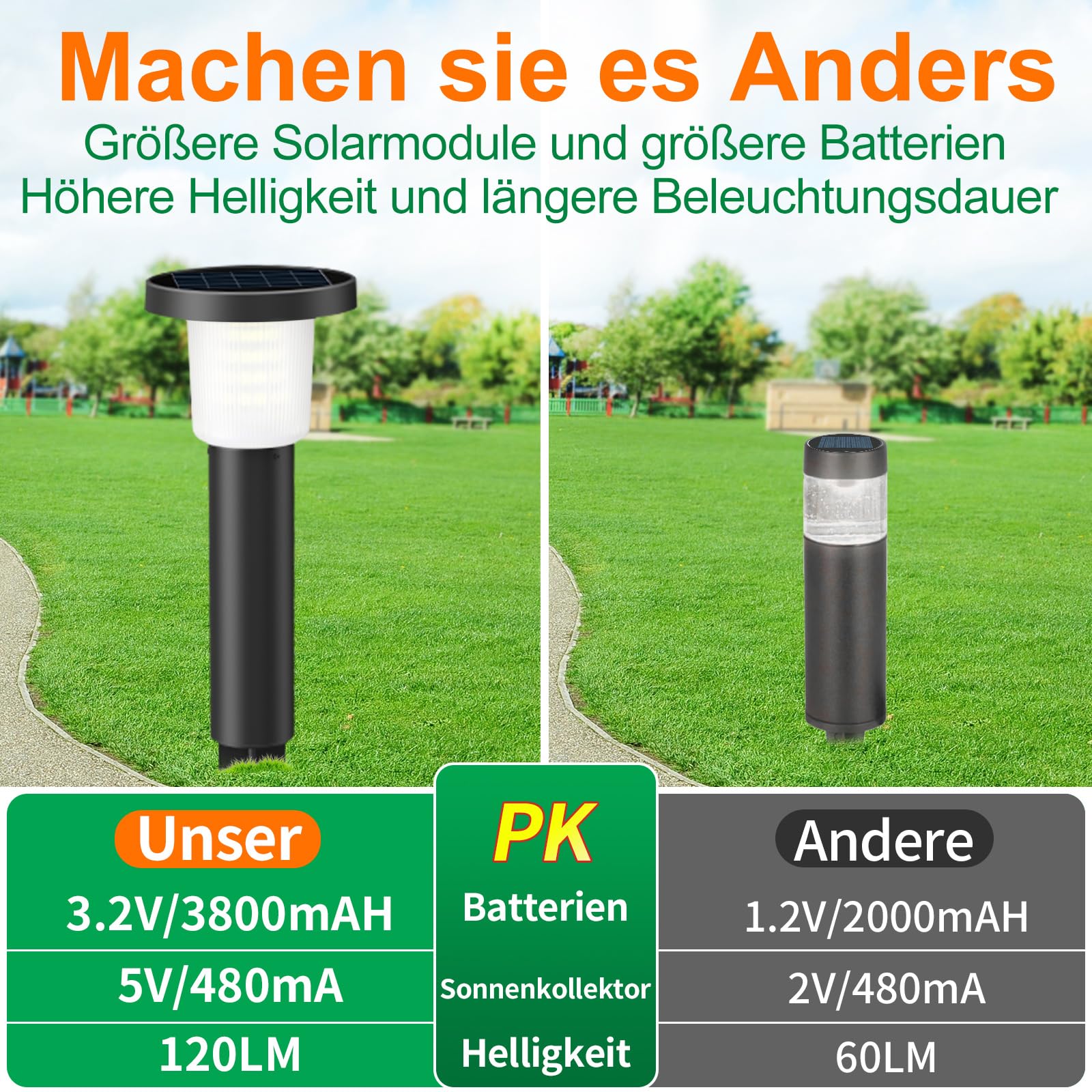 Lampy ogrodowe solarne, 0 rachunków za prąd, automatyczne włączanie/wyłączanie - Ta zasilana energią słoneczną lampa ogrodowa na zewnątrz wykorzystuje wysoko wydajny monokrystaliczny panel słoneczny o wysokiej sprawności do 30%. Wbudowany akumulator litowo-żelazowo-fosforanowy o dużej pojemności (3800 mAh) ładuje się w ciągu około 6 godzin w ciągu dnia i zapewnia czas świecenia od 10 do 12 godzin w nocy. Z jasnością do 500 lumenów jest ponad pięć razy jaśniejsza niż porównywalne produkty.