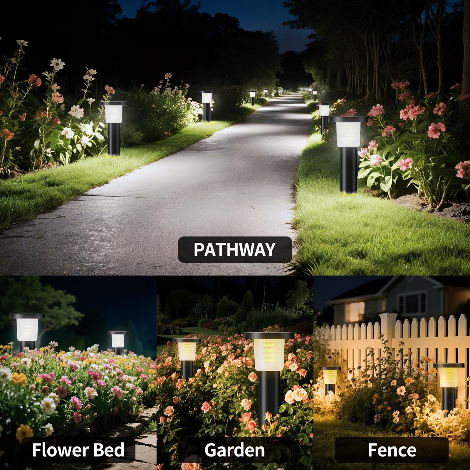 Wysokiej jakości materiały - Ta solarna lampa ogrodowa jest odporna na rdzę, deszcz i śnieg dzięki słupkom ze stali nierdzewnej 304 oraz obudowie z odlewu aluminiowego i jest cichym strażnikiem. Pokrywa akrylowa nie żółknie i nie pęka, zachowując nieskazitelną przejrzystość przez wiele lat – idealna na śnieżne zimy i gorące lata.