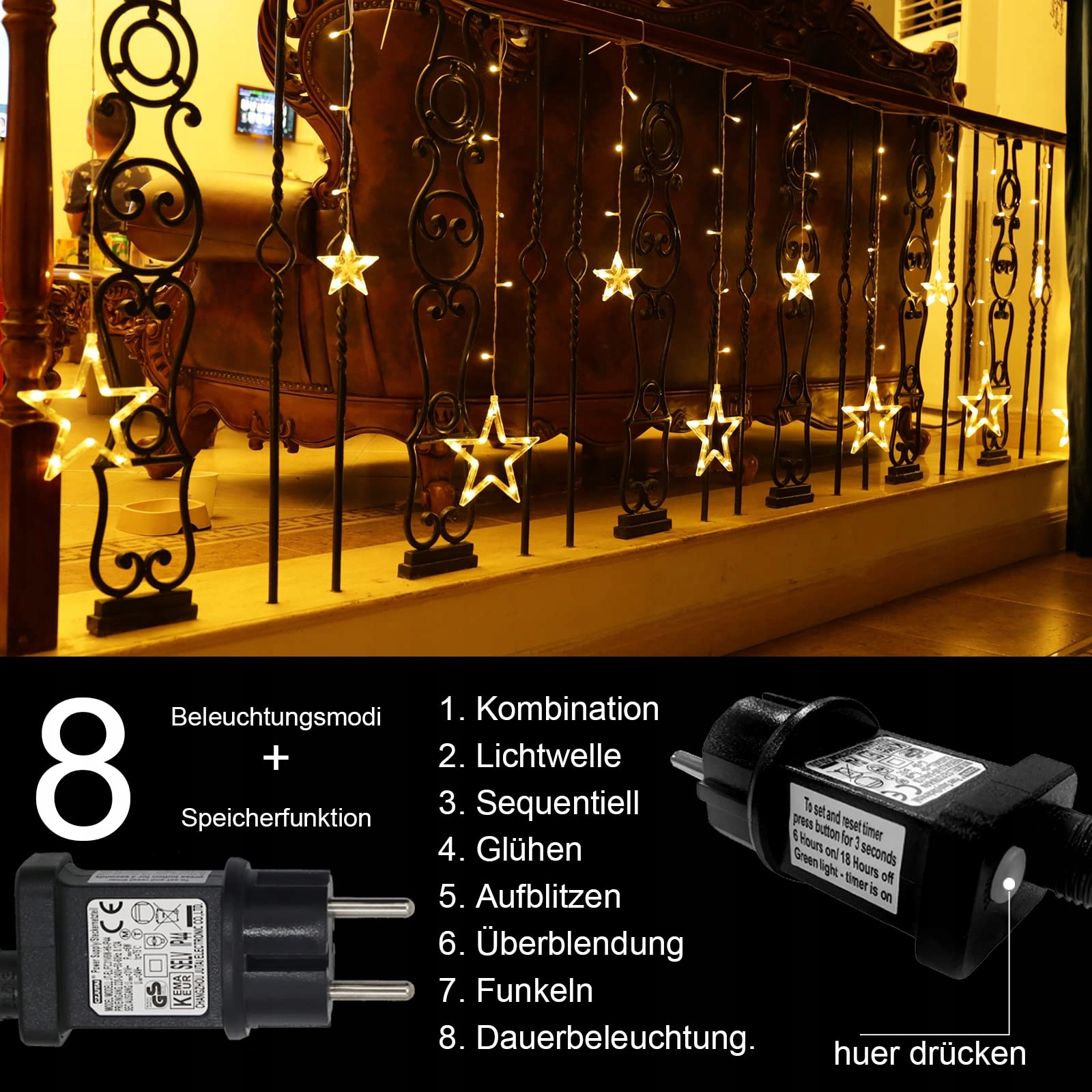[12 gwiazdek zasłona świetlna łańcuch do wnętrz/na zewnątrz] 12 gwiazdek (6 dużych i 6 małych), 138 sztuk ciepłobiałych LED łańcuchów świetlnych, 2,3m zasłona świetlna z gwiazdami do dekoracji okien, dodatkowe 5m odłączanego przewodu zasilającego. 12 haków zamontowanych, dzięki czemu można je łatwo zawiesić na karniszu bez wiercenia i wkrętów.