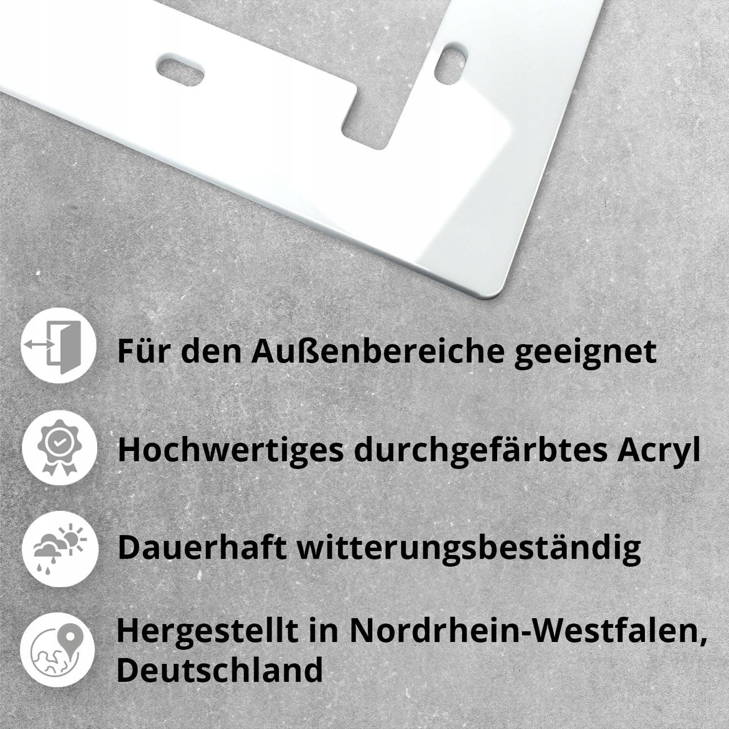 Wysokiej jakości akryl dla najwyższej jakości: wykonana z wyjątkowo trwałego i wysokiej jakości akrylu, osłona jest bardzo odporna na korozję i wytrzymała na wpływy zewnętrzne. Wysoka jakość materiału sprawia, że osłona zachowuje swój wygląd i funkcjonalność przez wiele lat, nawet w ekstremalnych warunkach pogodowych, takich jak deszcz, mróz czy nasłonecznienie. Nasze produkty iSecur są wykonane z wysokiej jakości materiałów. Made in Germany.
