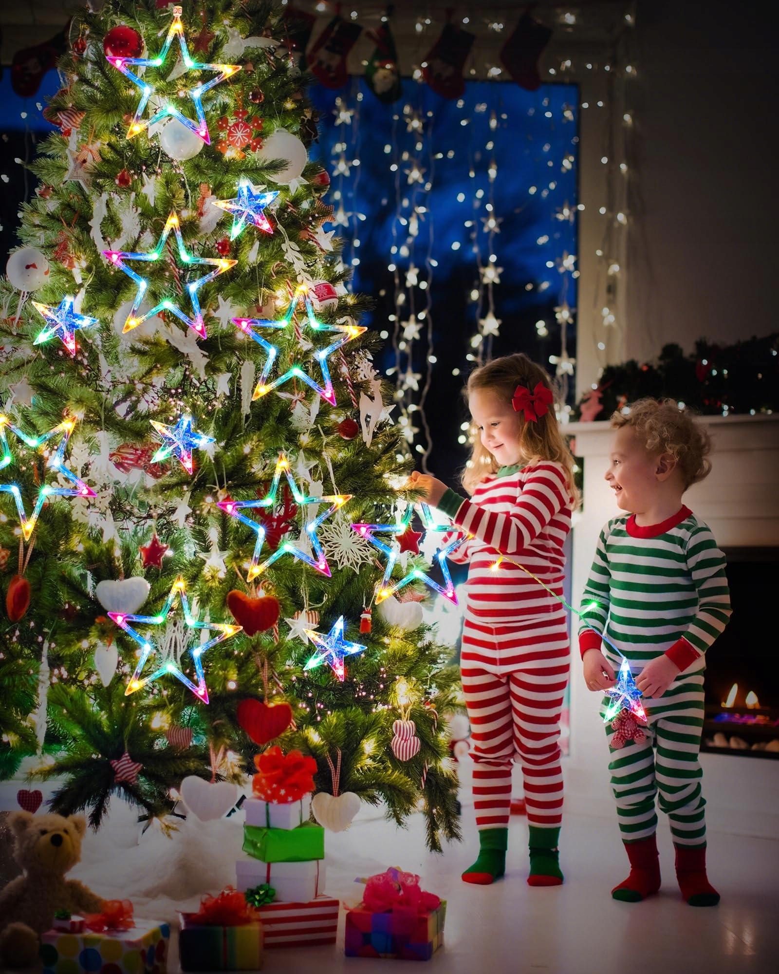 [Scenariusze zastosowania dla świątecznych lampek gwiezdnych]Te świąteczne lampki gwiezdne to piękna dekoracja w okresie Bożego Narodzenia, idealna do dekoracji okien, choinek, salonów, pokoi, schodów, balkonów, ogrodów i nie tylko.