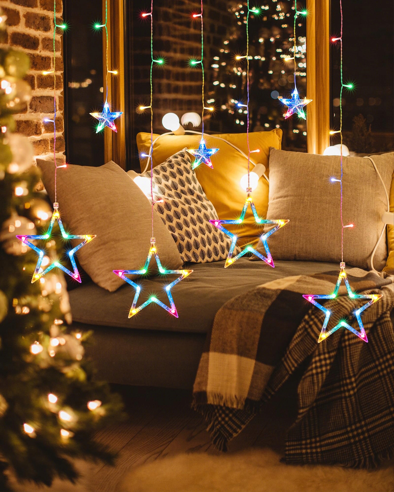 iShabao Lichterkette Sterne Strom 138 LED Weihnachtsbeleuchtung Fenster, 2.4x1m Lichtervorhang Fenster Weihnachten mit 12er Sterne, Lichterkette Innen Sterne mit Timer für Weihnachtsdeko (Bunt)