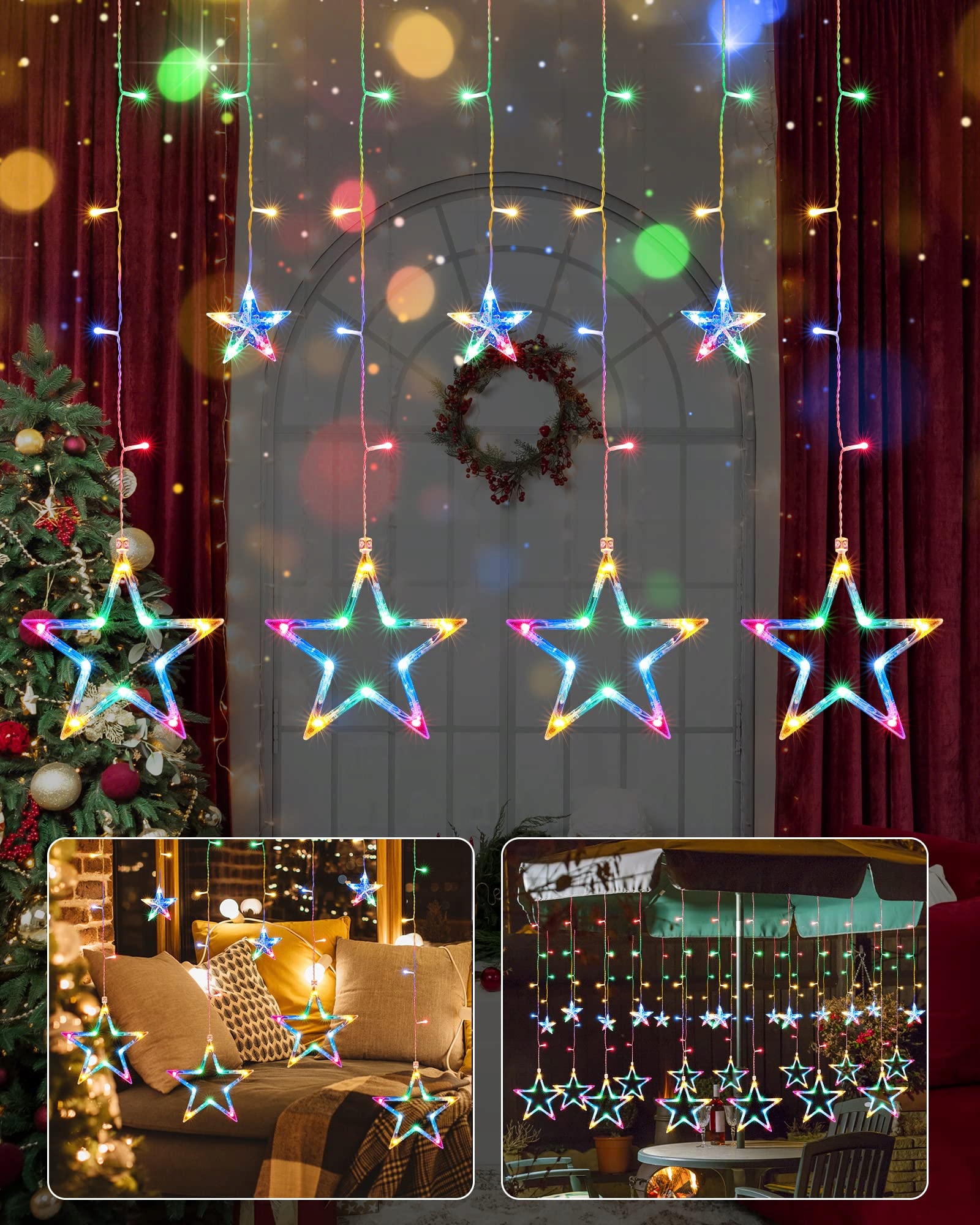 [Lichtervorhang Sterne mit End-to-End-Verbindung]Ta świąteczna dekoracja okienna ma 2,4 m szerokości i 1 m wysokości, z łączną liczbą 138 diod LED, rozmieszczonych na 12 nitkach, z których każda ma jedną gwiazdę (6 dużych i 6 małych), a także z 3 m odłączanym kablem. Piękne i ładne światło jednocześnie, sprawia, że Boże Narodzenie staje się jeszcze bardziej przytulne.