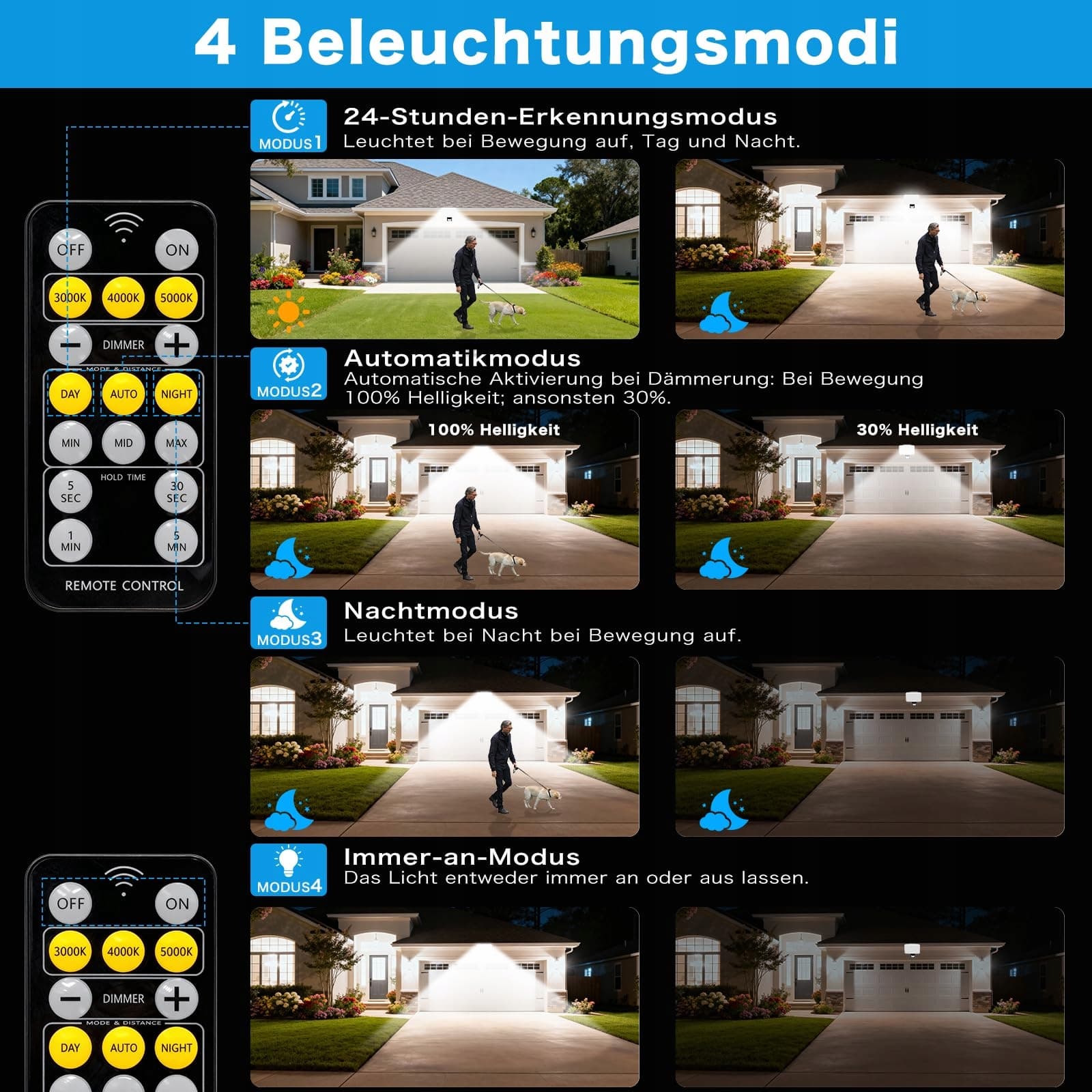 【4 tryby oświetlenia】Ten reflektor zewnętrzny z czujnikiem ruchu oferuje 4 tryby: 1. Tryb dzienny: automatycznie włącza się przy wykryciu ruchu, niezależnie od dnia lub nocy. 2. Tryb D2D: włącza się po zmroku – pełna moc przy ruchu, w przeciwnym razie przyciemnione światło czuwania (30%). 3. Tryb nocny: automatycznie włącza się przy wykryciu ruchu w nocy. 4. Tryb światła ciągłego: można go włączyć lub wyłączyć na stałe. Wygodnie przełączaj tryby za pomocą dołączonego pilota!