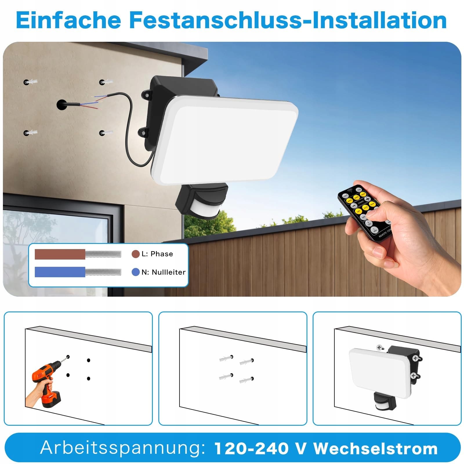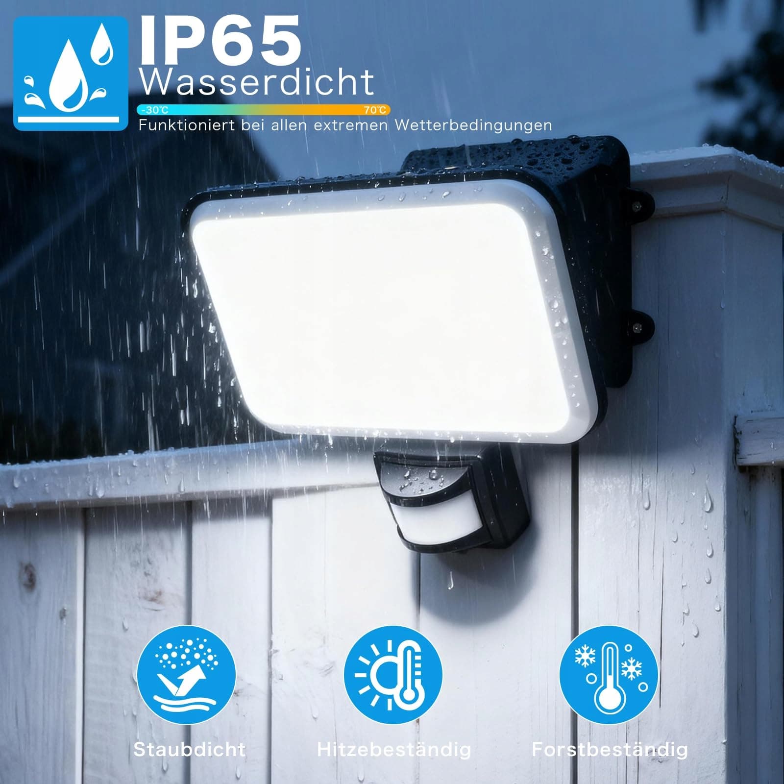 【Wysokoczuły czujnik ruchu i pilot】Ten reflektor LED na zewnątrz wyposażony jest w bardzo czuły czujnik ruchu o kącie widzenia 120°. Czas świecenia (5 s/30 s/1 min/5 min), jasność (20% do 100%), czułość (do 10 m) oraz tryb wykrywania można wygodnie ustawić za pomocą pilota. Niezależnie czy wracasz wieczorem do domu, parkujesz samochód czy organizujesz imprezę w ogrodzie – to inteligentne oświetlenie zapewni Ci bezpieczeństwo i spokój ducha.