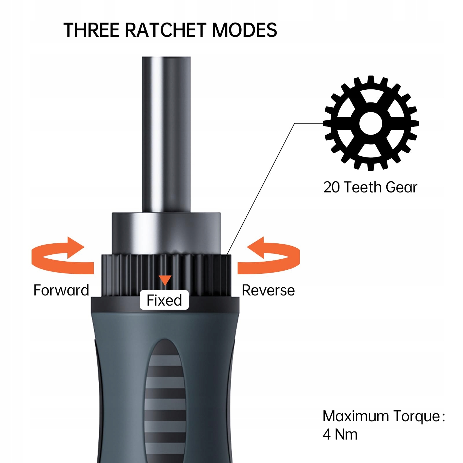 【Magnetyczny śrubokręt z grzechotką】 Uchwyt grzechotki ma 3 tryby napędu – obracanie grzechotki w lewo, aby dokręcić śruby, obracanie grzechotki w prawo, aby poluzować śruby. A gdy grzechotka znajduje się w pozycji środkowej, funkcja grzechotki jest zablokowana. Ergonomiczny uchwyt i konstrukcja grzechotki znacznie poprawiają efektywność pracy i redukują zmęczenie rąk.