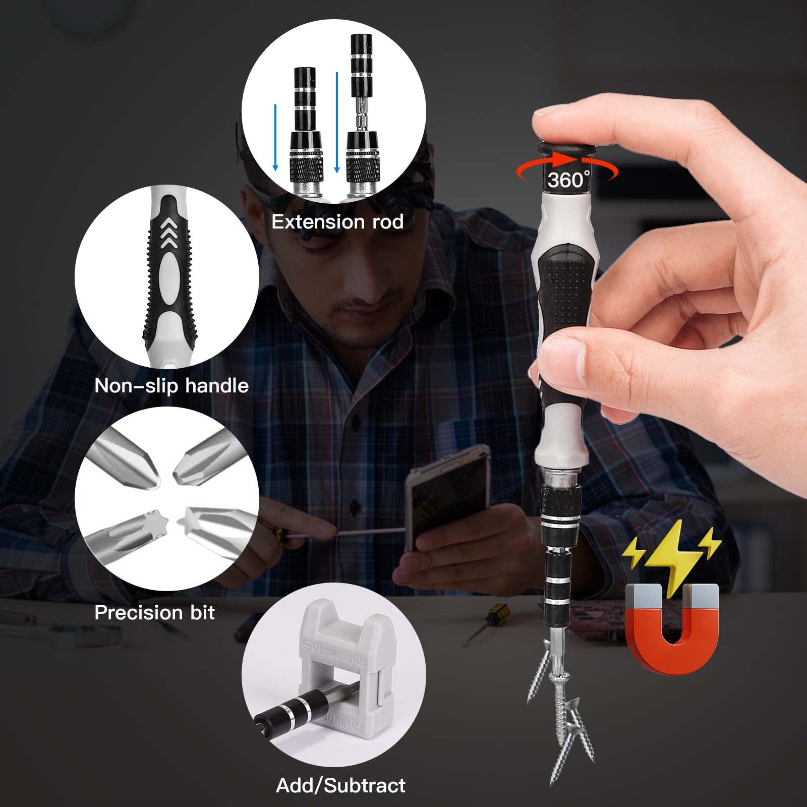 Precyzyjny uchwyt: Uchwyt jest powiększony i wykonany z materiału silikonowego, ergonomiczny i antypoślizgowy. Wkrętak ma magnetyczny czubek, co umożliwia efektywniejsze dokręcanie śrub. Wyposażony w elastyczną przedłużkę i antystatyczne pęsety, dzięki czemu każda część może być łatwo chwycona i włożona w wąskie miejsca, do których uchwyt nie może dotrzeć.