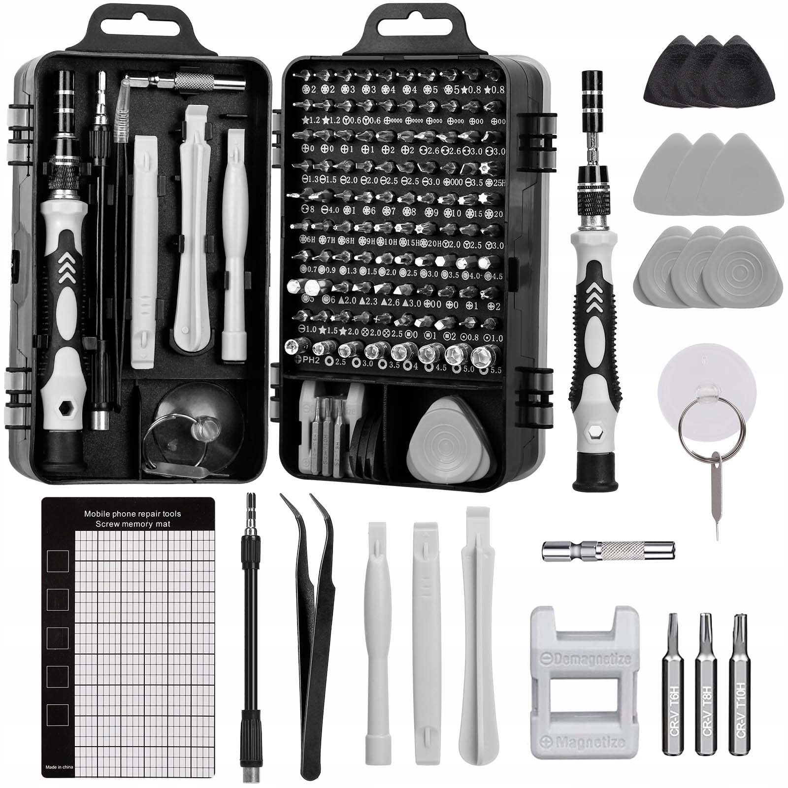 Zestaw wkrętaków precyzyjnych: Ten zestaw zawiera do 122 części, które umożliwiają przeprowadzanie profesjonalnych napraw. Zestaw zawiera niezbędne narzędzia oraz dużą liczbę wkrętaków, które pomogą Ci w pracach domowych. Zestaw zawiera główne narzędzie, czyli uchwyt - podstawę wkrętaka - oraz do 98 bitów w różnych rozmiarach i kształtach.