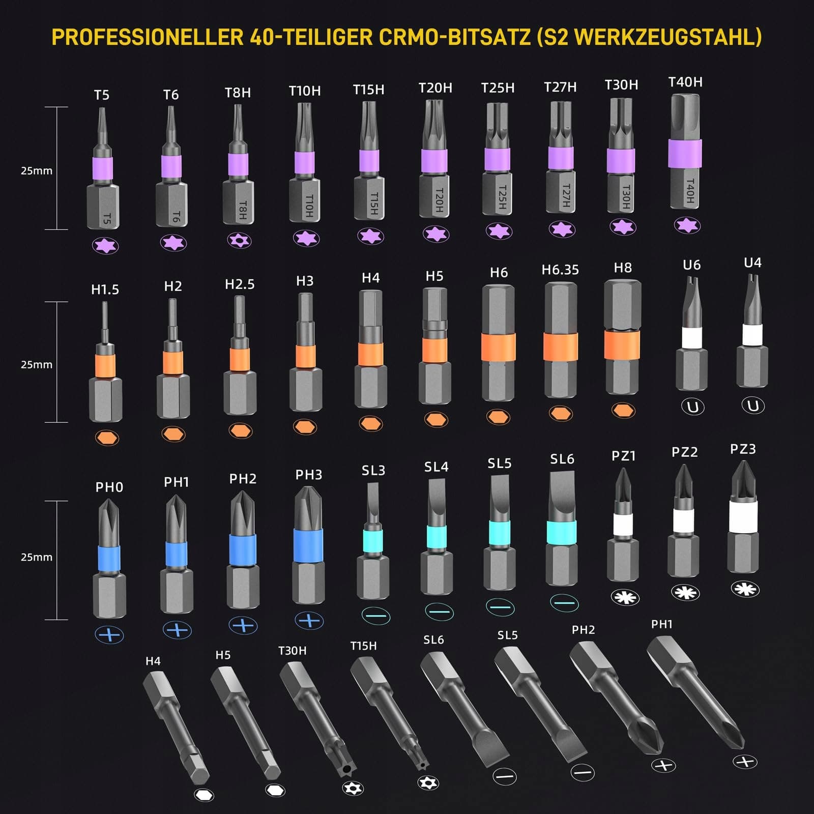 【Trwała konstrukcja aluminiowa】Zestaw wkrętaków dla mechaników precyzyjnych ma solidny uchwyt T z stopu aluminium oraz wysokotwarde końcówki ze stali S2 – idealne do intensywnego użytku. Obie komponenty są szczególnie odporne na zużycie. Kolorowe końcówki umożliwiają szybką identyfikację i szczególnie komfortową obsługę.
