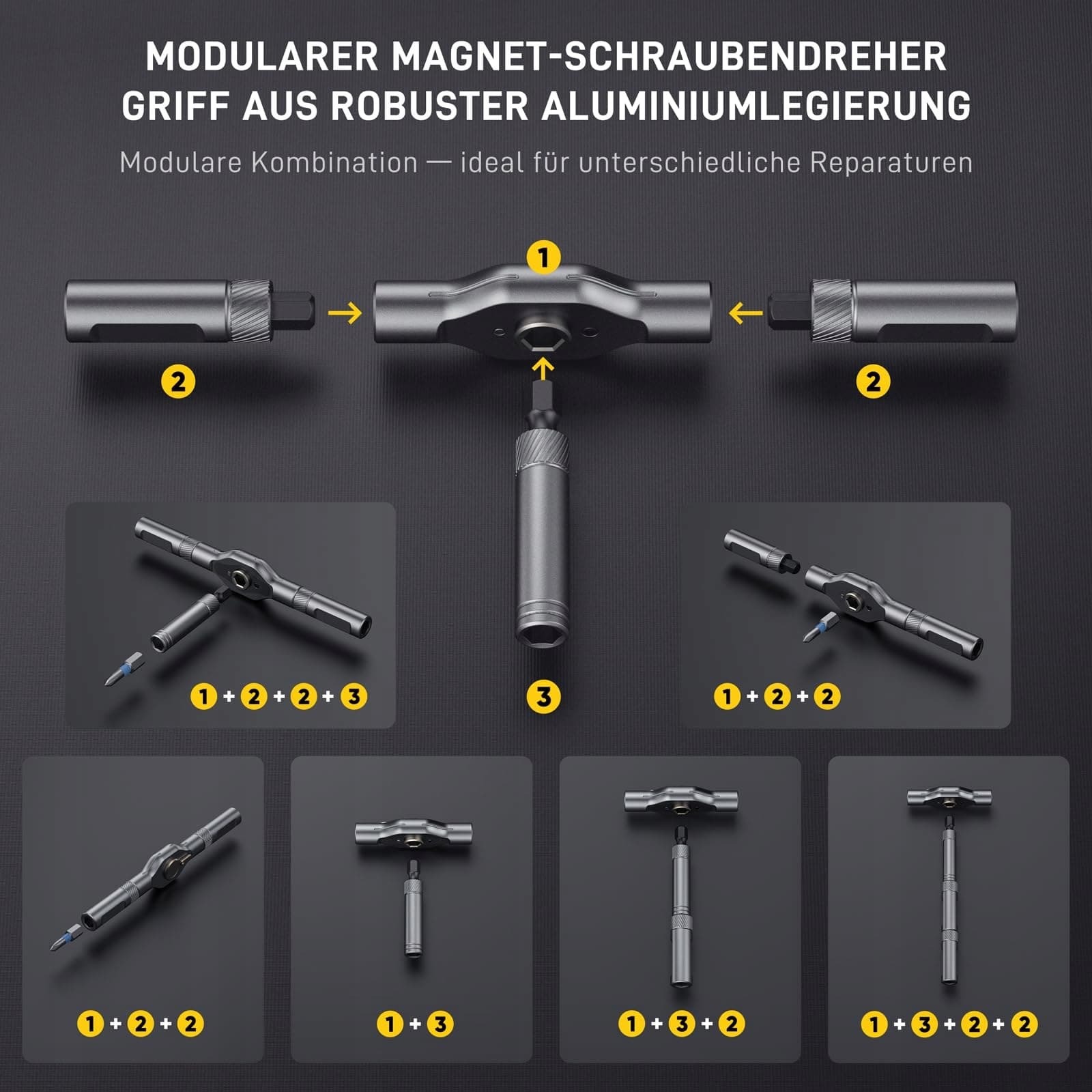 【Wkrętak z uchwytem T】Modularny, ergonomiczny uchwyt aluminiowy z odłączaną jednostką zapadkową – idealny do elastycznej pracy nawet w wąskich miejscach. Możliwość dowolnego łączenia do różnych scenariuszy użycia. Zapadka 6,2°/58-zębowa umożliwia płynne obracanie w jedną stronę: Śruby można luzować lub dokręcać z użyciem do 80 % mniejszej siły!