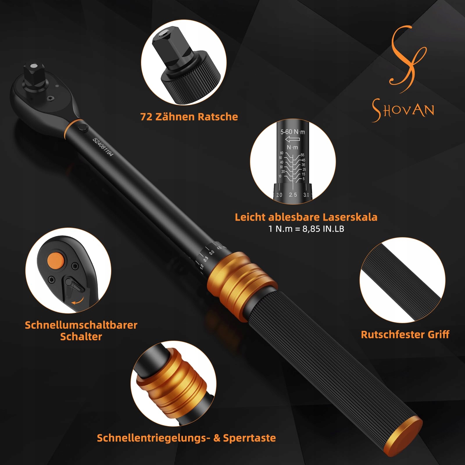 3/8 cala klucz dynamometryczny, 72-zębowa głowica grzechotki obrotowej, zestaw kluczy dynamometrycznych 5-60 Nm do rowerów, motocykli i wymiany świec zapłonowych w samochodach, z adapterem 3/8'' na 1/4'', przegubem uniwersalnym 3/8'' oraz przedłużką 75 mm