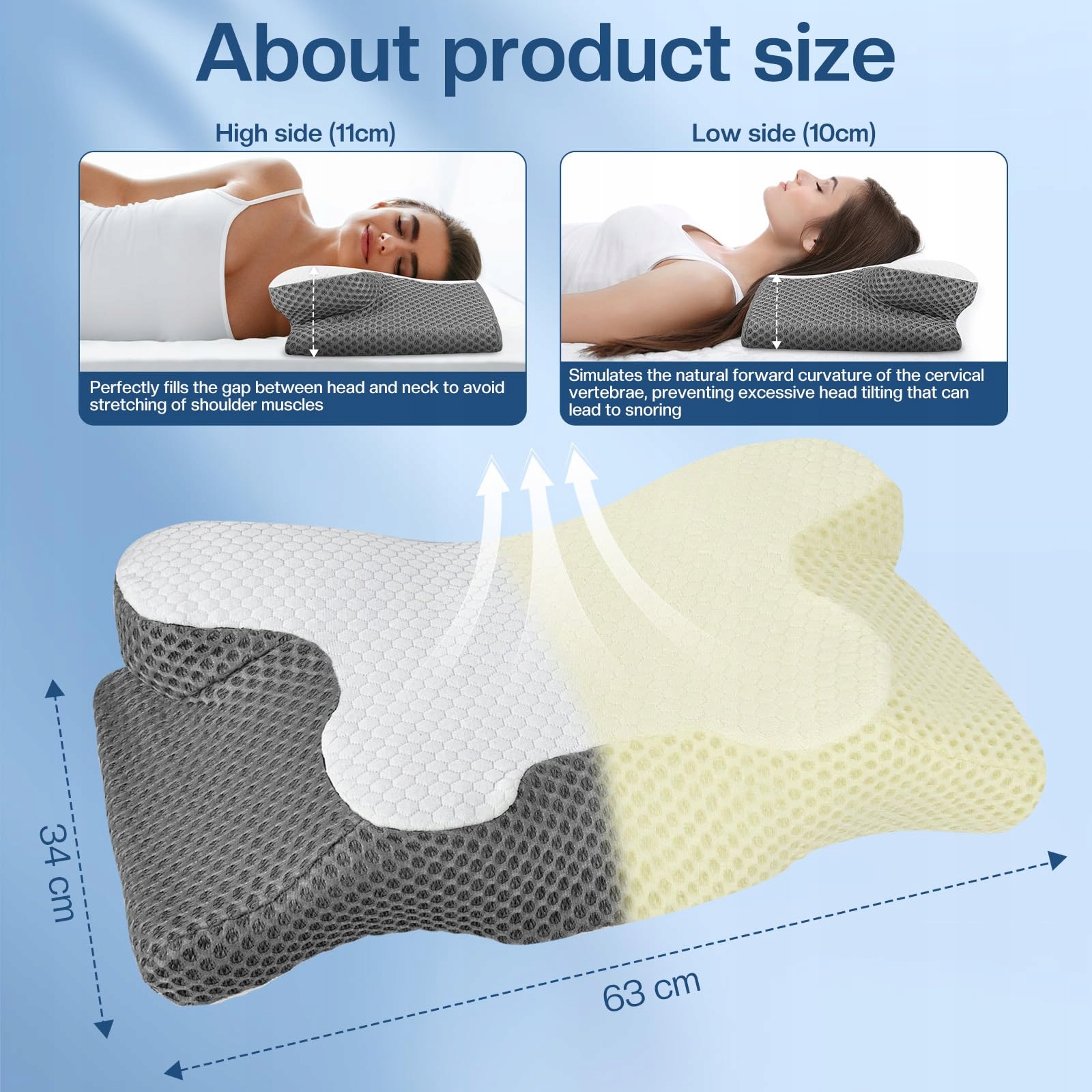 Ergonomiczny design: Ta poduszka na ból szyi została specjalnie zaprojektowana dla zdrowia kręgosłupa szyjnego i idealnie dopasowuje się do kształtu głowy i szyi. Dostępna jest w dwóch wysokościach (9 cm i 12 cm), co umożliwia różne pozycje snu – niezależnie od tego, czy śpisz na plecach, boku czy brzuchu
