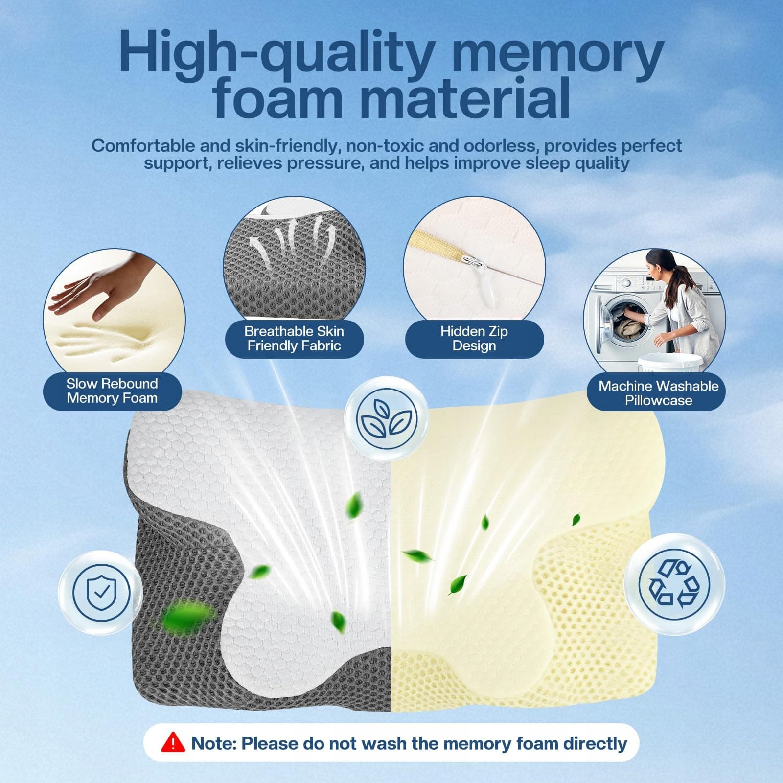 Odpinany i zmywalny pokrowiec: Poduszka do spania posiada odpinany pokrowiec, który można prać w pralce. Pianka memory ma strukturę oddychającą i antybakteryjną, która skutecznie odpycha roztocza i wilgoć oraz zapewnia doskonałe wsparcie nawet po długim użytkowaniu