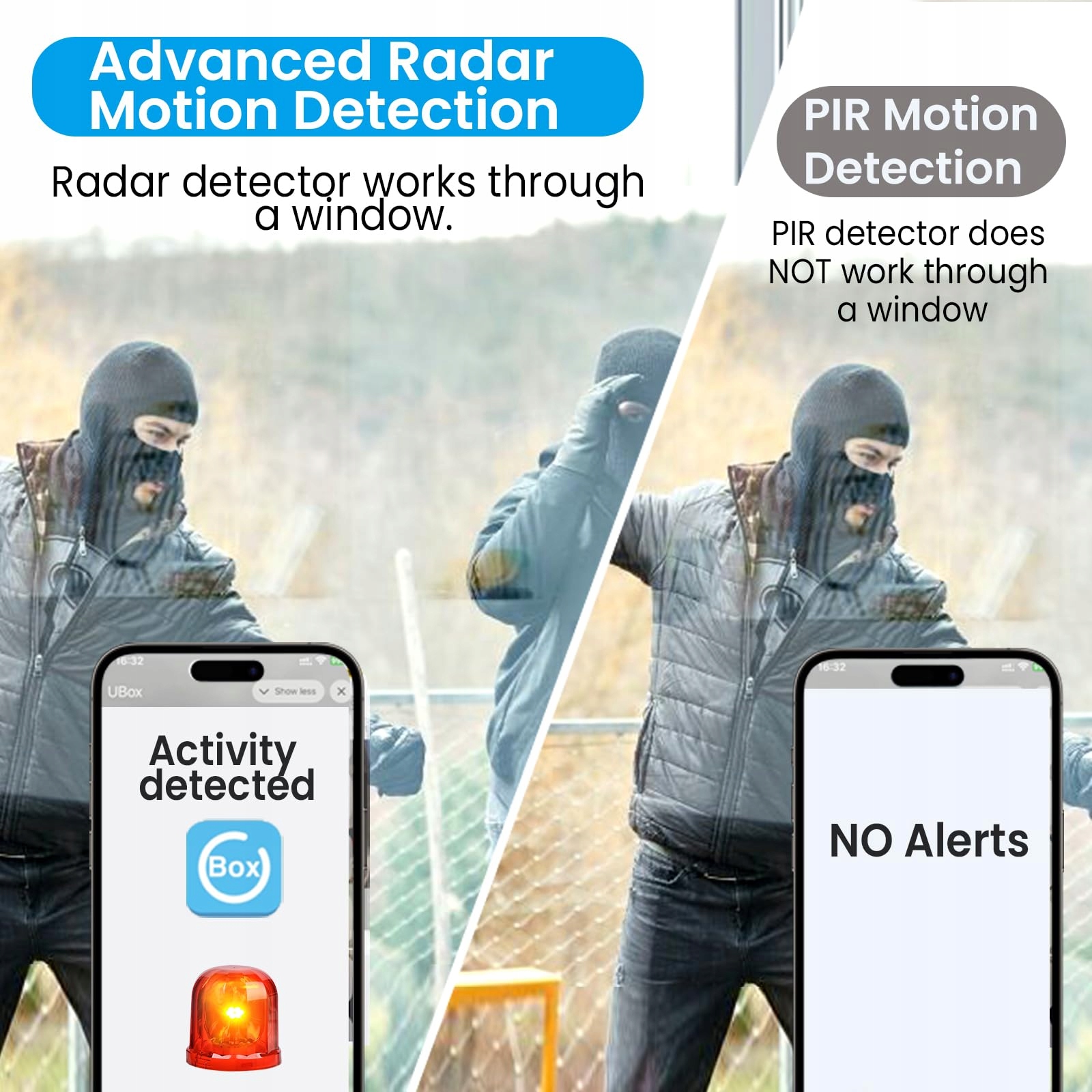 【Zaawansowane wykrywanie ruchu radarowego: wykrywanie ruchu przez okna/szkło】Kamera do monitoringu wewnętrznego została zmodernizowana z PIR na wykrywanie ruchu radarowego i jest bardziej czuła niż wykrywanie PIR. Posiada większy zasięg wykrywania do 12 m. Wyższa zdolność penetracji, na przykład kamera do monitoringu wykrywa ruch przez okno i natychmiast wysyła ostrzeżenie przez aplikację mobilną. Jednocześnie wszystkie filmy alarmowe są zapisywane na karcie pamięci lub w chmurze.