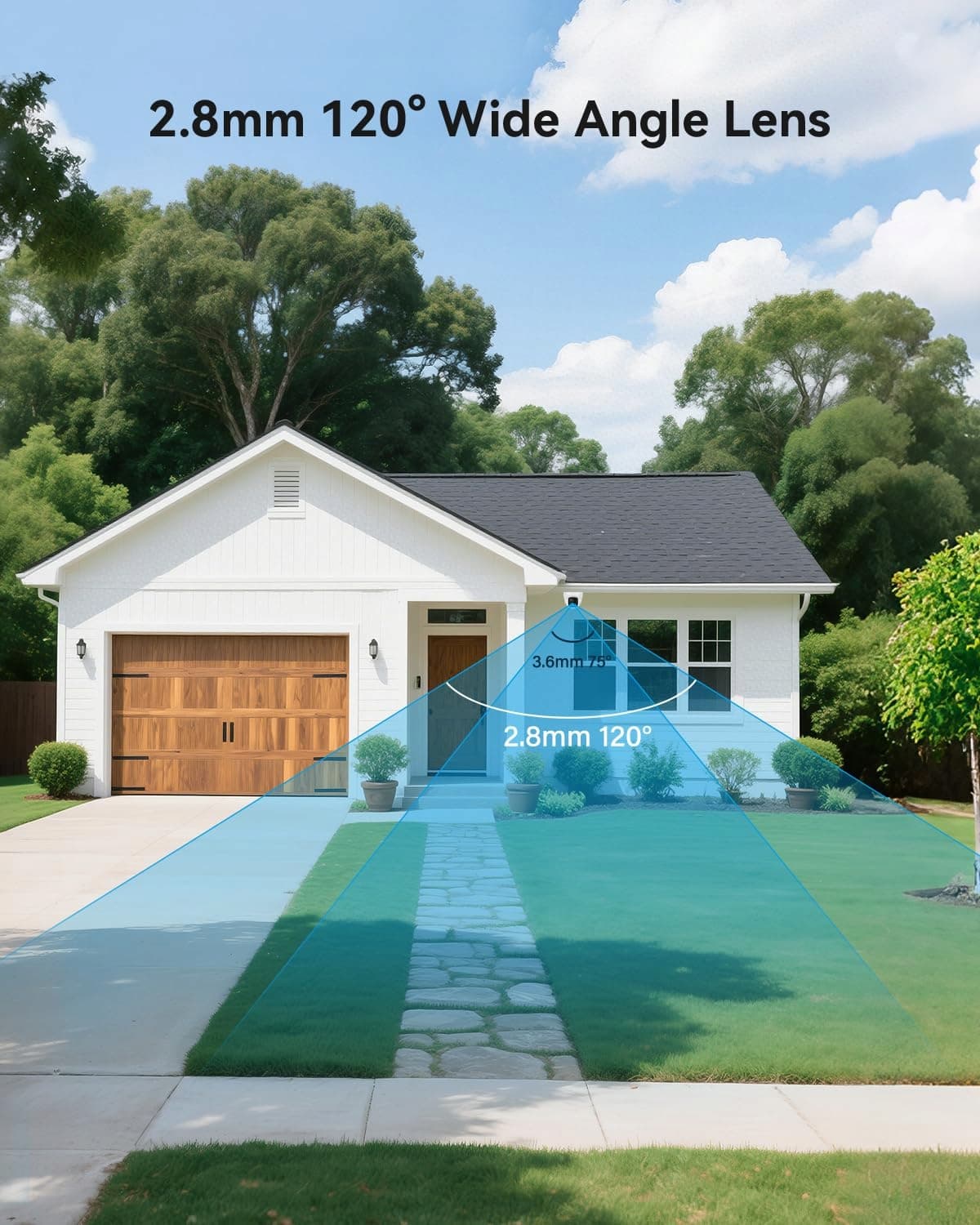 👍【Szeroki kąt 120° i ręczna regulacja kąta】Ten zestaw kamer zewnętrznych wifi wyposażony jest w obiektyw 2,8 mm, który zapewnia szeroki kąt widzenia 120° i skutecznie pokrywa dużą powierzchnię, dzięki czemu nie przegapisz żadnych ważnych nagrań. Ponadto posiada funkcję ręcznej regulacji kąta o 360 stopni, która pozwala użytkownikom elastycznie dostosować kierunek kamery do swoich potrzeb i precyzyjnie uchwycić wybrane sceny.