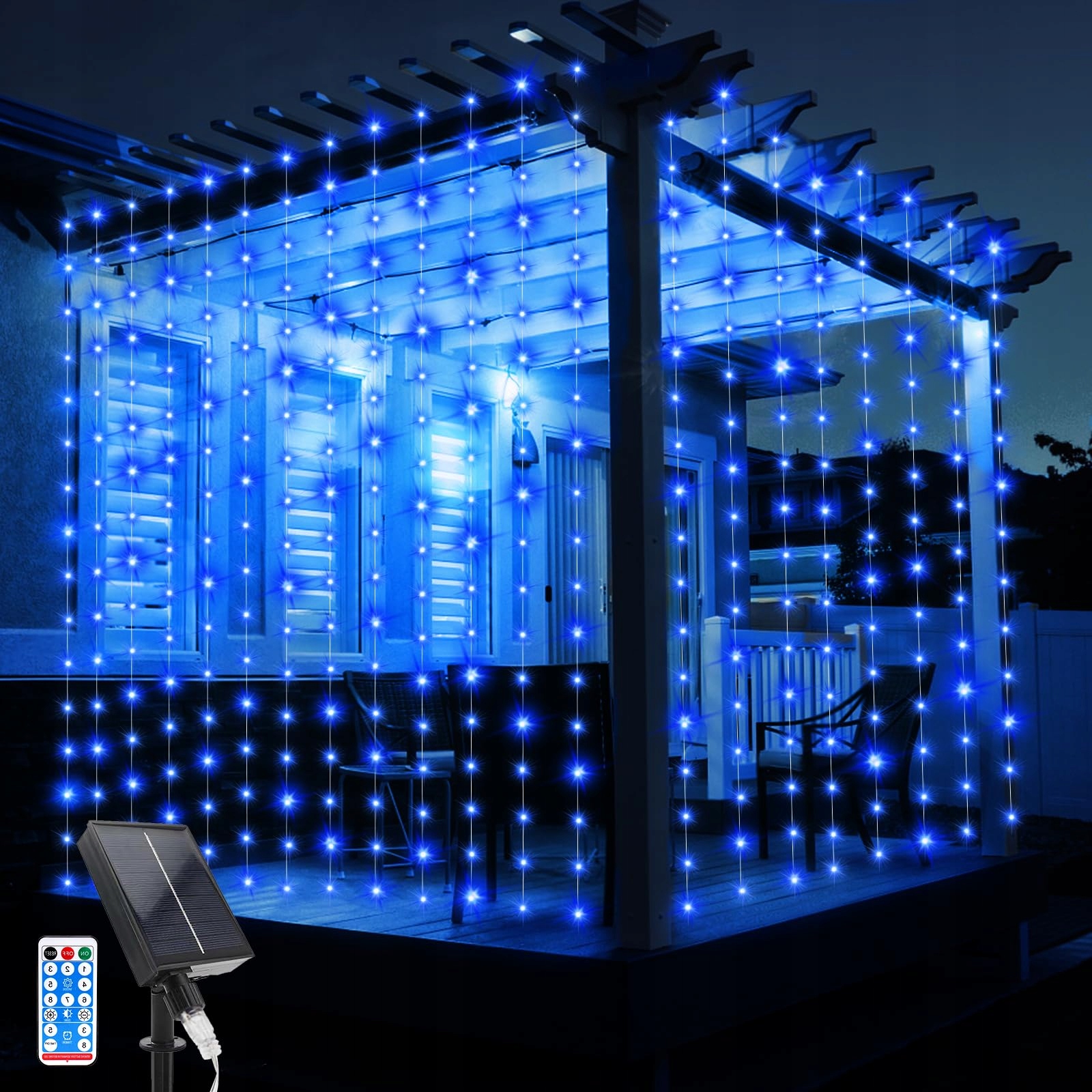 JIMACRO Solarne Światełka Kurtynowe, 3Mx3M Solarne Światełka Kurtynowe 10 Sztuk Światełek 8 Trybów 300 LED Wodoodporne Światełka z Pilotem do Ogrodu Altany Balkonu Wesela Imprezy Dekoracji