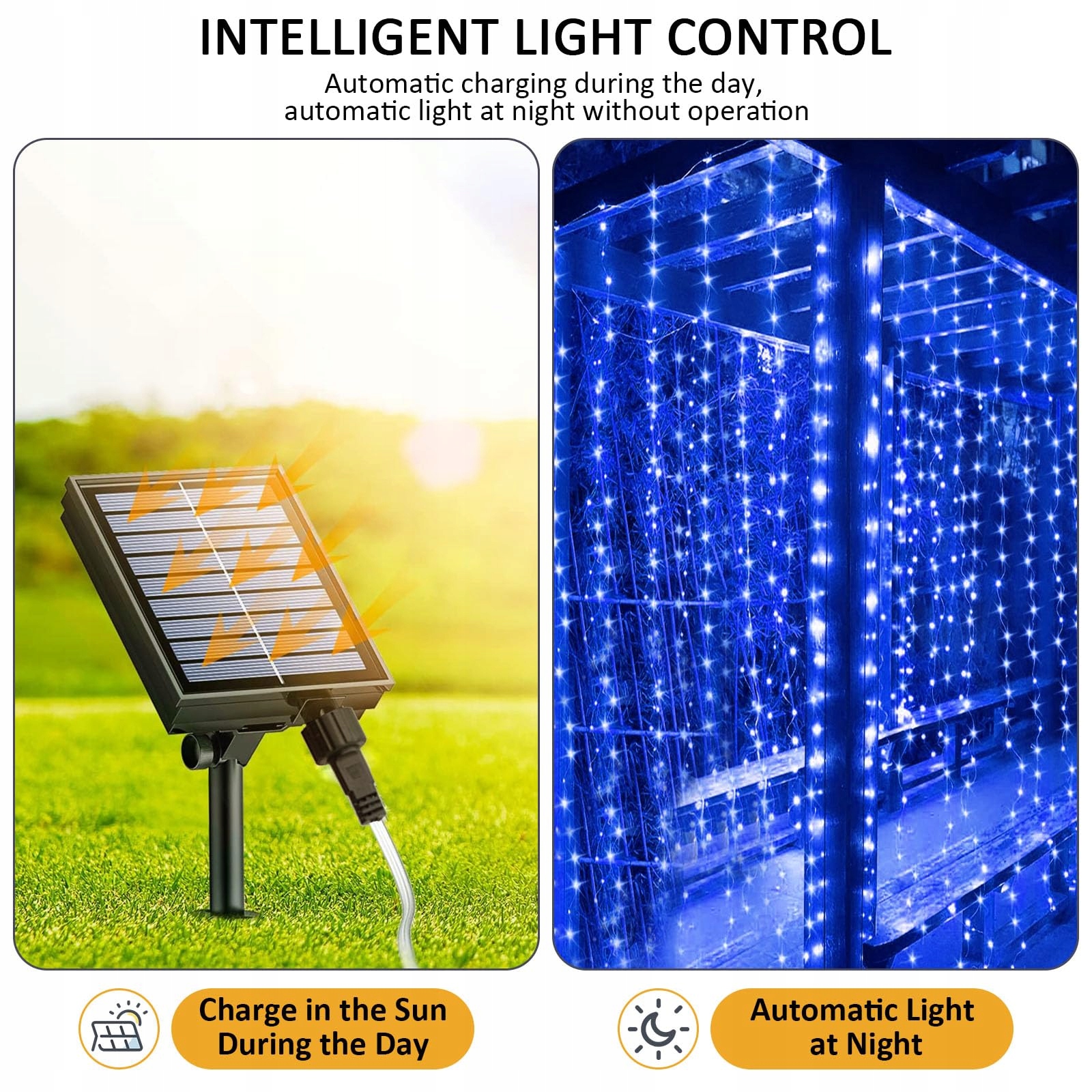 💡300 LED Światełka Kurtynowe💡Solarne światełka kurtynowe mają 10-częściowe miedziane druty owinięte PVC z 30-LEDami na każdym drucie, łącznie 300-LEDów. 10-haków zostało zaprojektowanych, aby łatwo zawiesić światełka kurtynowe, tworząc kurtynę świetlną o wymiarach 3M (S) x 3M (W), z 2M przewodem zasilającym. Solarne światełka są wyposażone w uchwyty do ziemi i śruby rozprężne, które można wbić w ogród lub trawnik. Można je również przymocować do ścian za pomocą śrub rozprężnych lub do solidnego betonu.