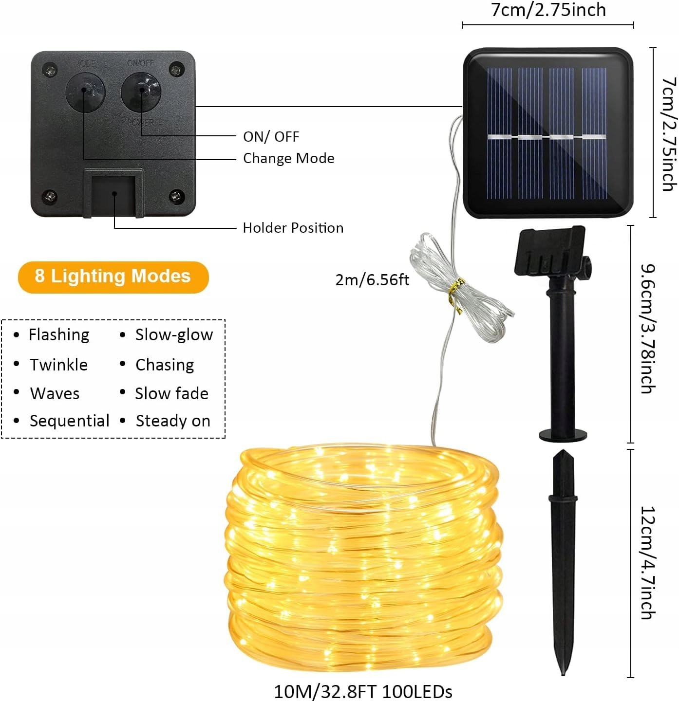 JIMACRO Zewnętrzny Solarny LED Wąż Świetlny, IP65 Wodoodporny Solarny Łańcuch Świetlny na Zewnątrz 12m 100LEDs Solarna Dekoracja Świetlna z 8 Trybami Oświetlenia do Ogrodu Drzewa Imprezy Dekoracji Świątecznych