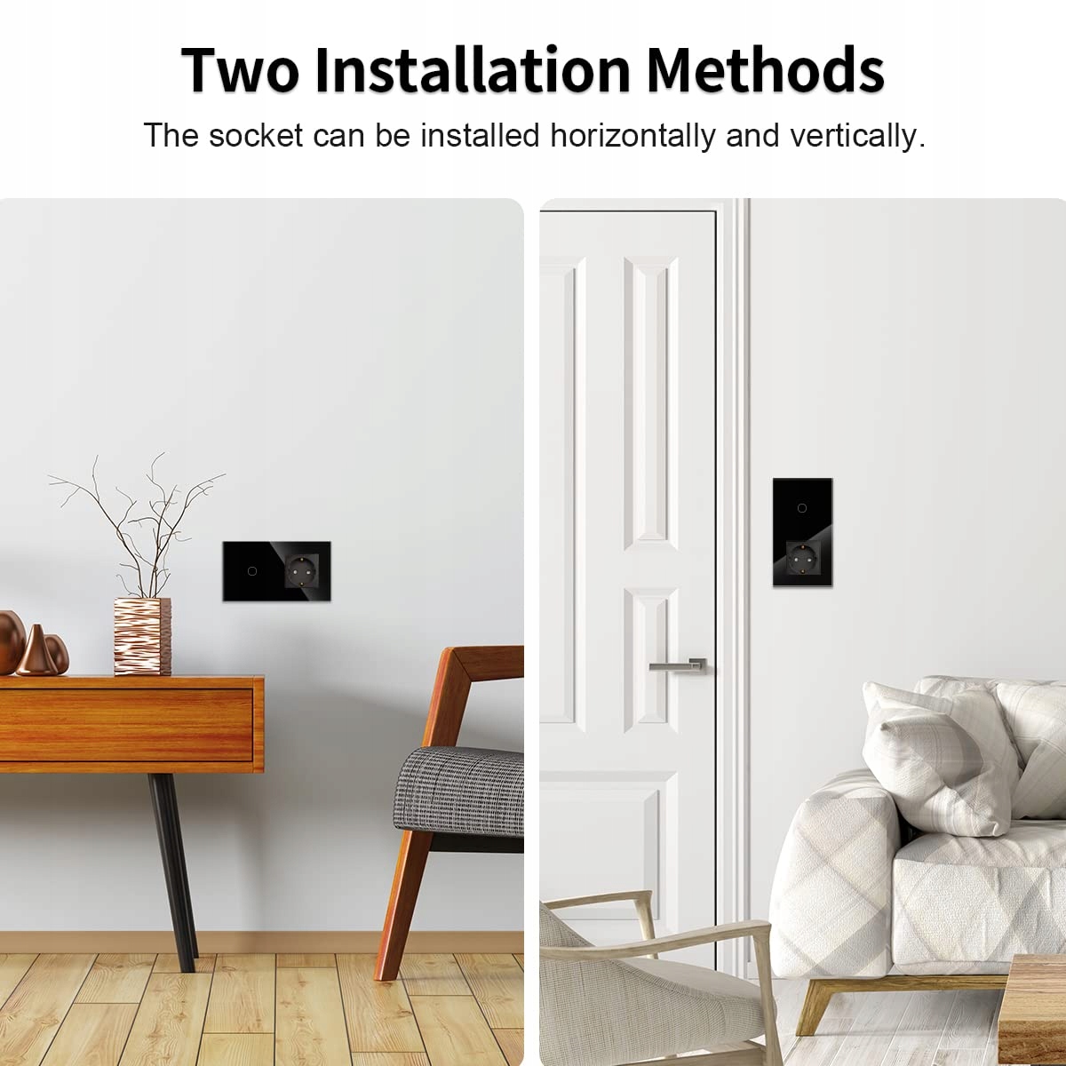 【Stylowy wygląd】Panel dotykowy z eleganckiego szkła idealnie wpasowuje się w każde pomieszczenie. Gniazdo z włącznikiem podtynkowym można montować zarówno pionowo, jak i poziomo na ścianie.