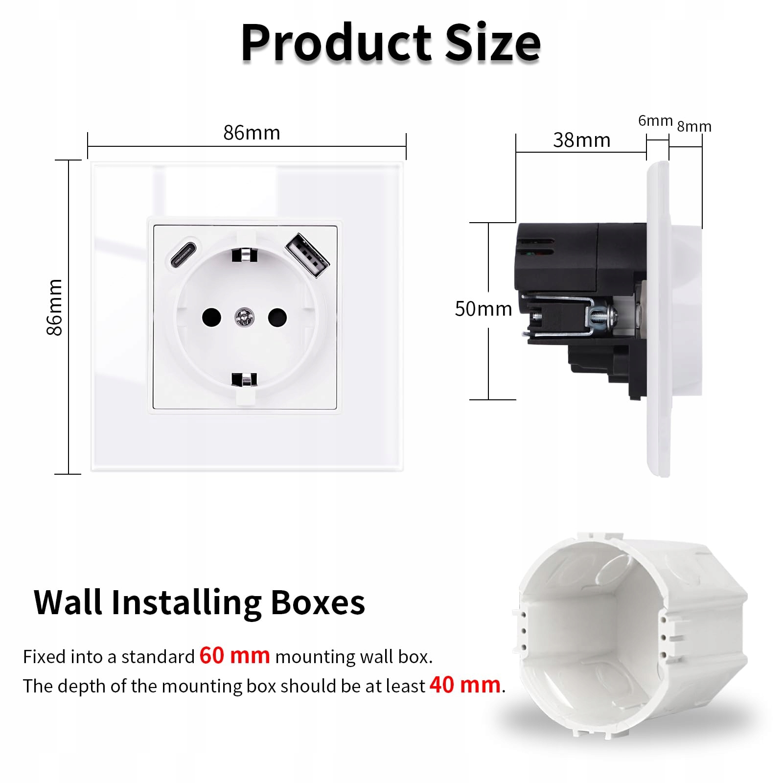 Gniazdo USB: 5 V/2,1 A, dwa porty ładowania USB (Typ A i Typ C), 250 VAC, 86 mm x 86 mm