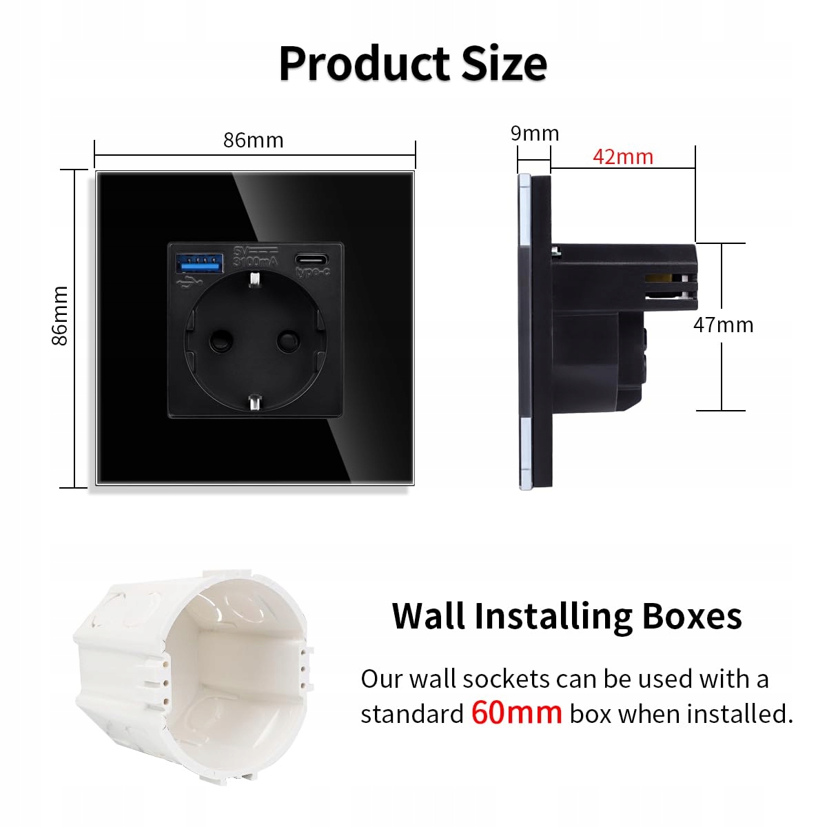 【Łatwe w instalacji】 Gniazdo 16-amperowe z wysokiej jakości, ognioodpornego tworzywa PC. Bezśrubowa nakładka na ścianę. Szklana płyta. 20W Szybkie Ładowanie, dwa porty ładowania USB (Typ A i Typ C), 250 VAC, 86 mm x 86 mm.
