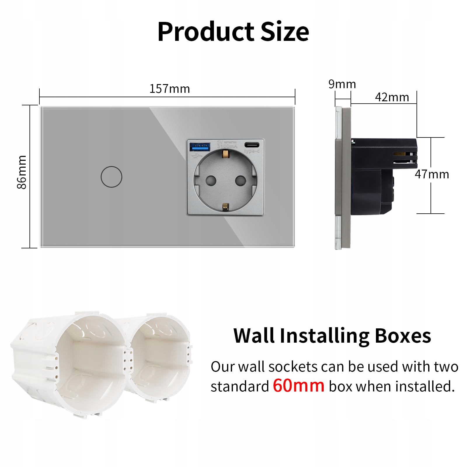 【Łatwe w instalacji】 Gniazdo 16-amperowe z wysokiej jakości, ognioodpornego tworzywa sztucznego PC. Nie wymaga przewodu neutralnego. Bezśrubowa nakładka na ścianę. Szklana płyta. 20W Szybkie ładowanie, dwa porty USB (Typ-A i Typ-C), 86 mm x 157 mm.