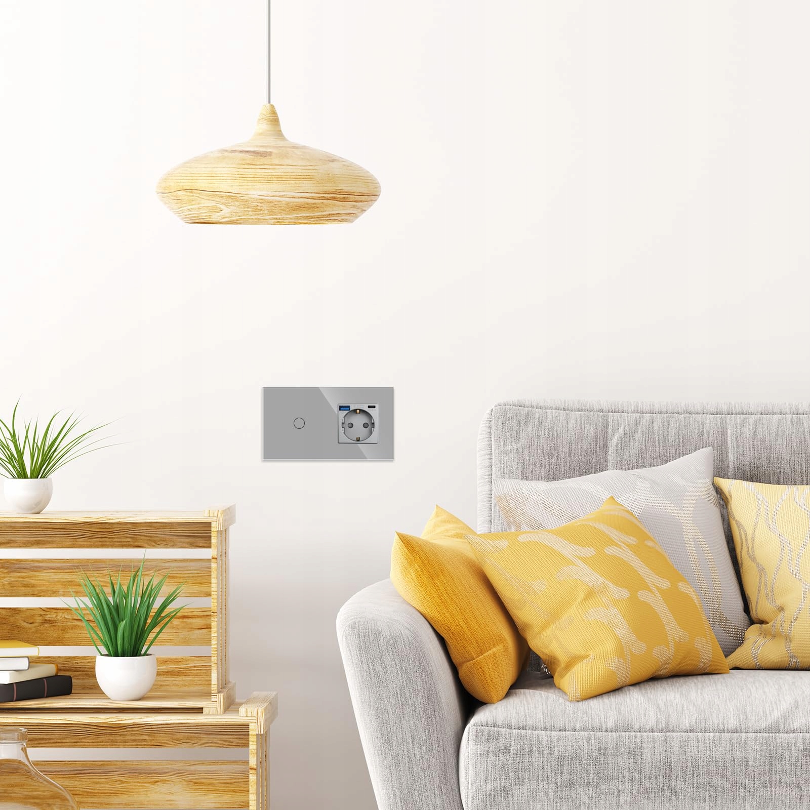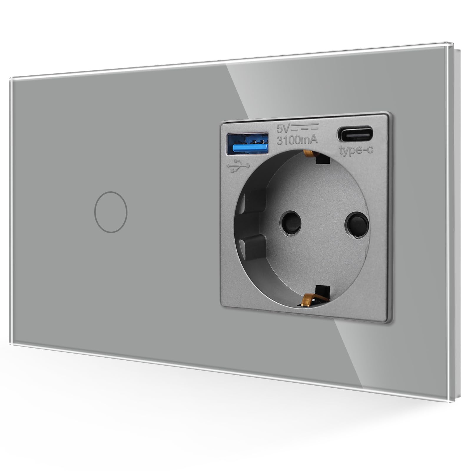 Gniazdo USB JIMEIDA 20W Szybkie ładowanie z włącznikiem w kolorze szarym, 16A Gniazdo Schuko 3-w-1 podtynkowe z 1 ładowarką USB i 1 portem Typ-C, 1-gniazdowy 1-biegunowy włącznik dotykowy ze wskaźnikiem LED