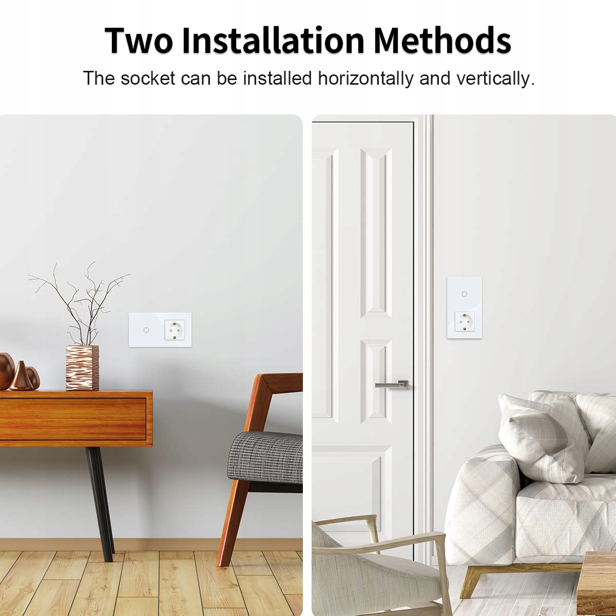 【Stylowy wygląd】Panel dotykowy z eleganckiego szkła idealnie wpasowuje się w każde pomieszczenie. Gniazdko z włącznikiem podtynkowym można montować zarówno pionowo, jak i poziomo na ścianie.