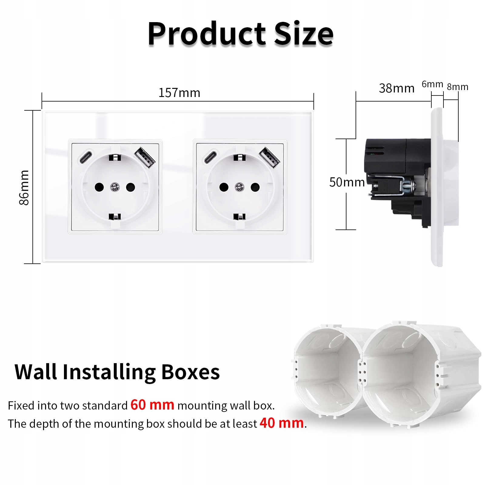 Gniazdo USB: 5 V/2,1 A, dwa porty ładowania USB (typ A i typ C), 250 VAC, 157 mm x 86 mm