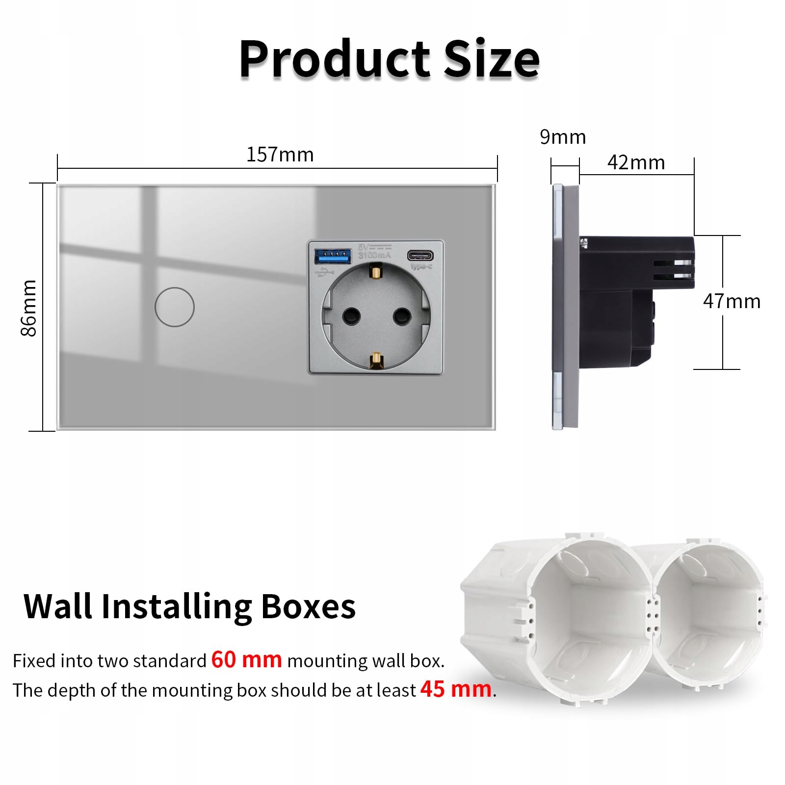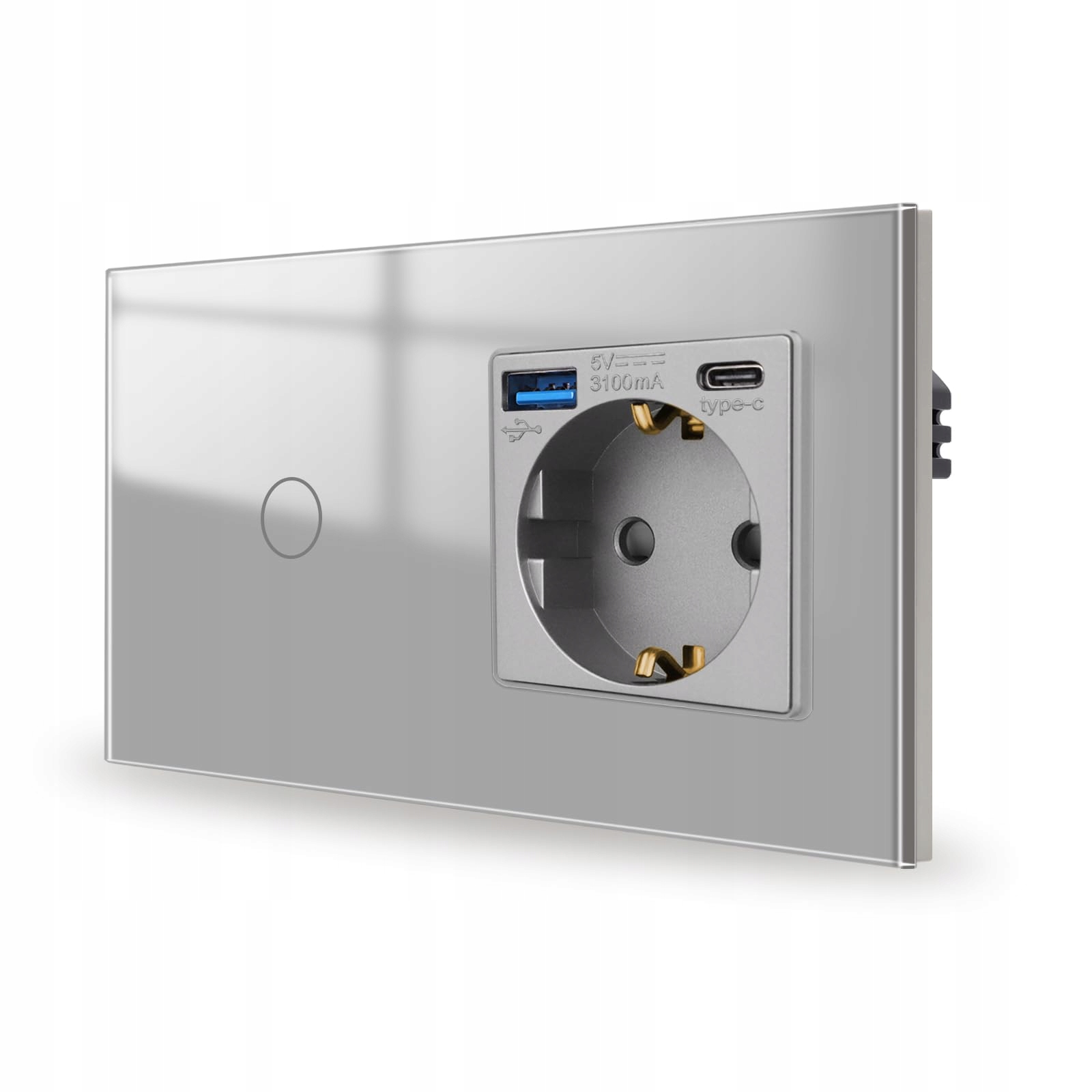 JIMEIDA Touch włącznik światła z gniazdkiem 20W szybkie ładowanie z portami USB (USB A i Type C) Szary 1 gniazdo 1 kierunek, panel szklany i dioda LED statusu włącznika, brak wymaganej żyły neutralnej, 157 * 86mm