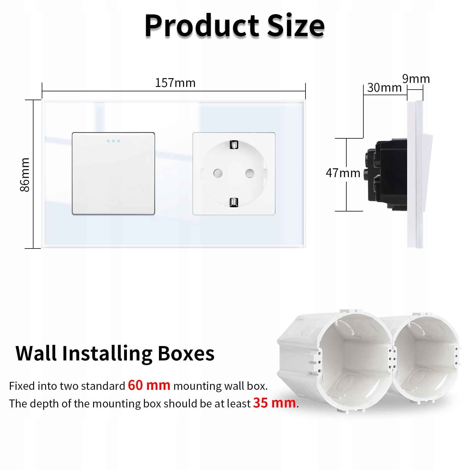 Wprowadzenie produktu: Mechaniczny włącznik ze szkła z gniazdkiem, głębokość montażu obudowy: 21 mm, 157 mm x 86 mm, wewnątrz znajdują się śruby mocujące. Proszę zwrócić uwagę na instrukcję obsługi podczas instalacji