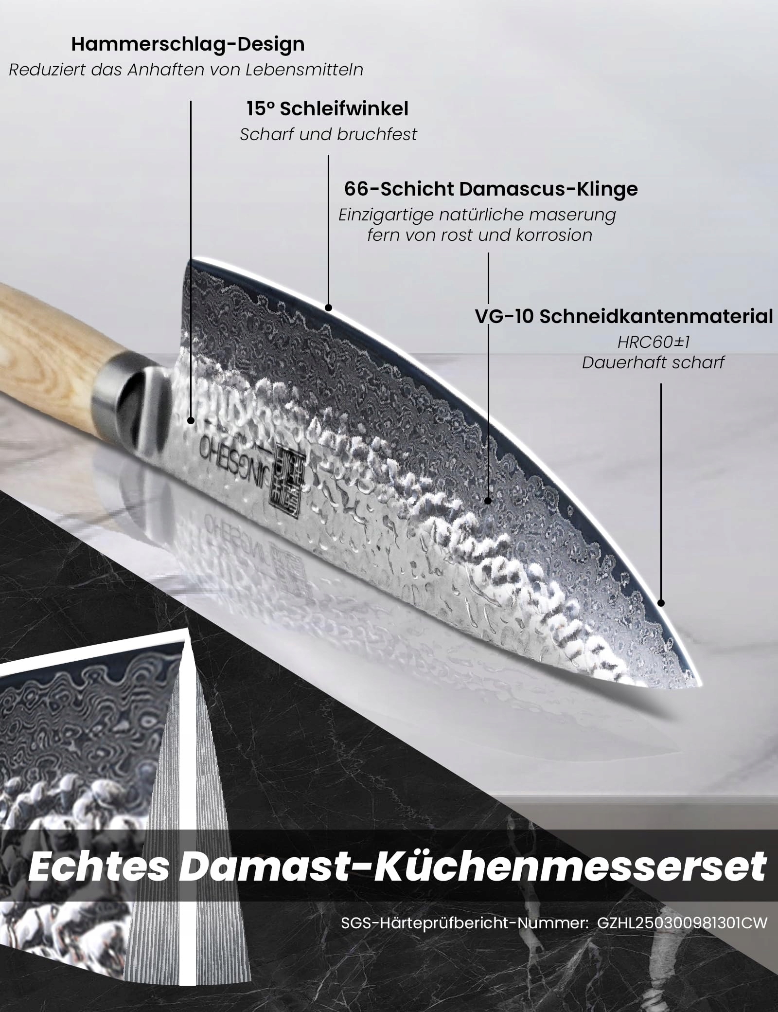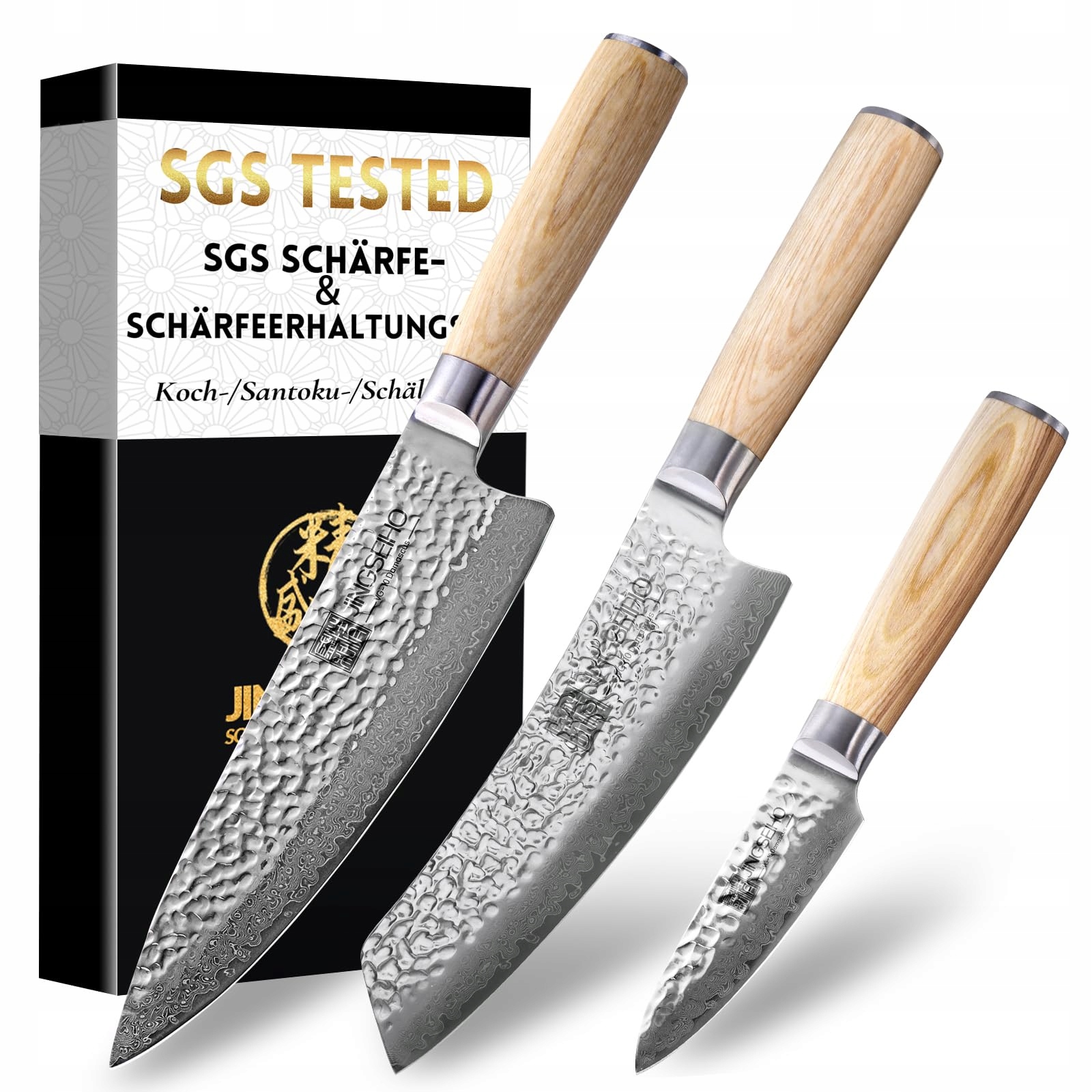 Zestaw noży Jingseiho z Japonii z prawdziwej stali damasceńskiej, VG-10 i 67-warstwowej, SGS-zatwierdzona ostrość i trwałość cięcia, nóż kuchenny/Santoku/obierak, idealny do użytku domowego i jako prezent