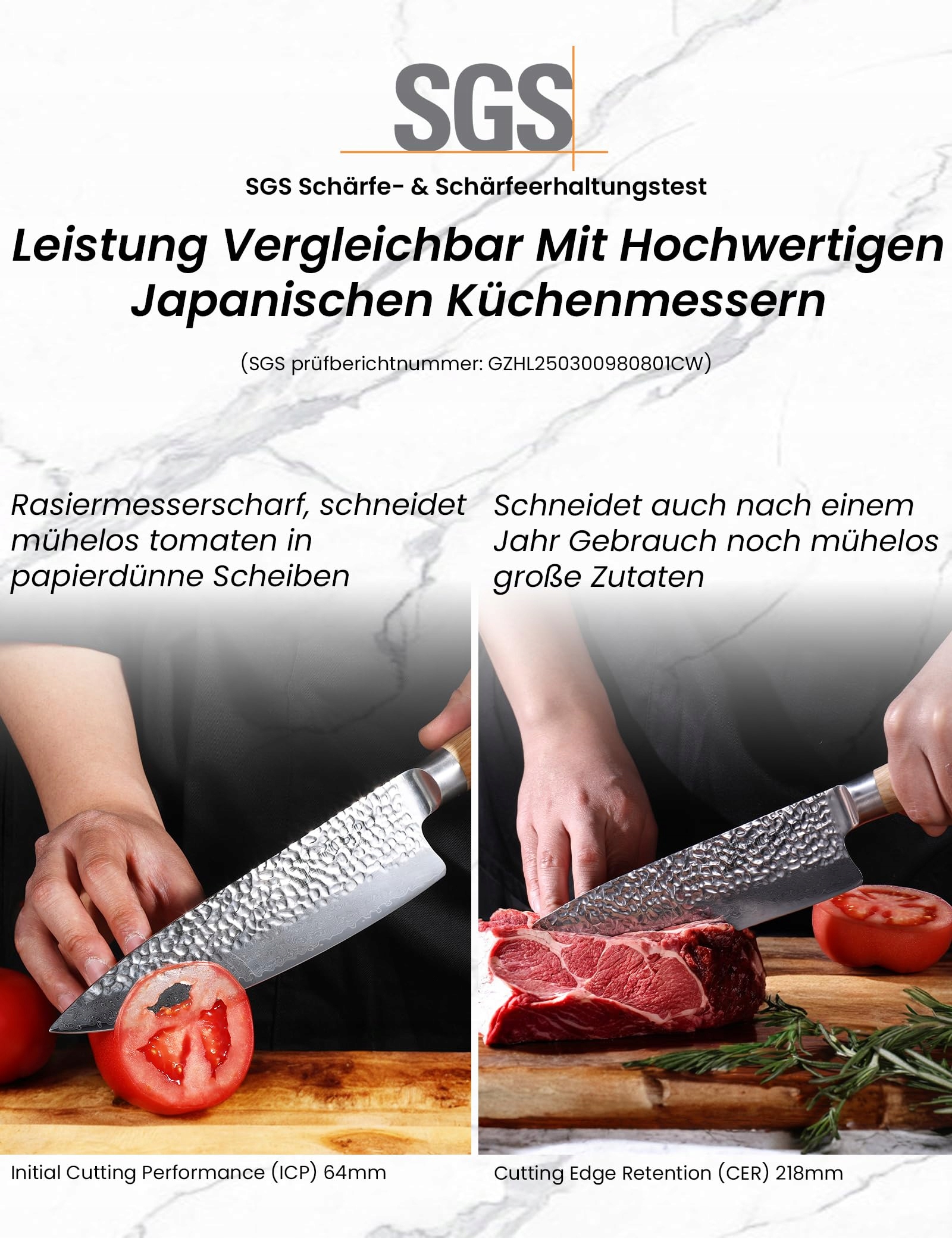 Prawdziwa 67-warstwowa stal damasceńska, rdzeń VG-10 – Wykonana z prawdziwej 67-warstwowej stali damasceńskiej i rdzenia VG-10, udoskonalona przez japońskie rzemiosło i precyzyjne hartowanie; SGS-zatwierdzona twardość HRC 60,5 (numer raportu: GZHL250300981301CW) zapewnia, że każde cięcie pozostaje ostre i bez wysiłku, od mięsa, które czysto oddziela się od kości, po warzywa, które są krojone w jednym ruchu.