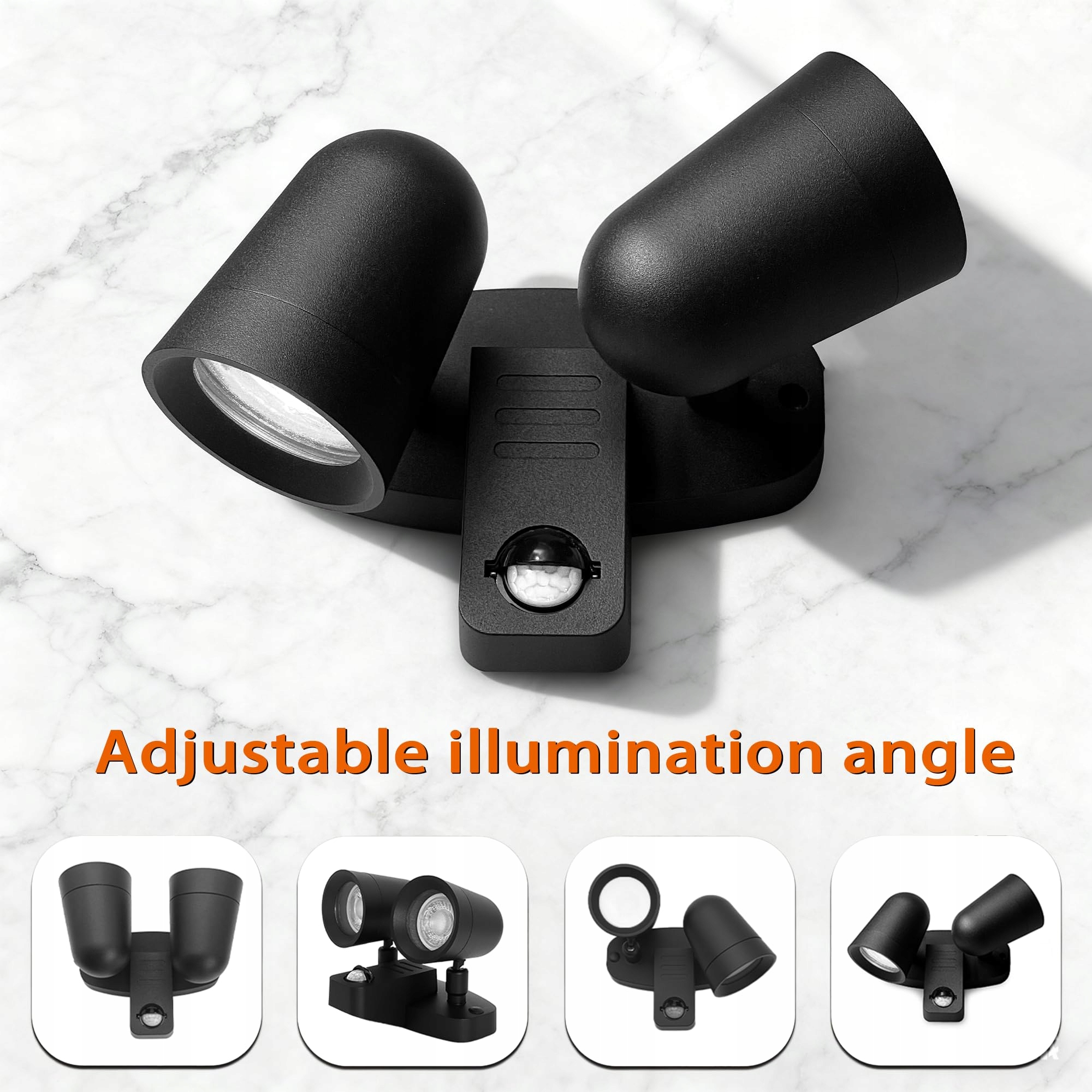 JNR LED Lampa zewnętrzna z czujnikiem ruchu PIR, wodoodporna lampa zewnętrzna IP54 z czujnikiem ruchu 230V podwójny reflektor obracany o 330°, lampa zewnętrzna z 2x5W GU10 3000K ciepła biel, czarna