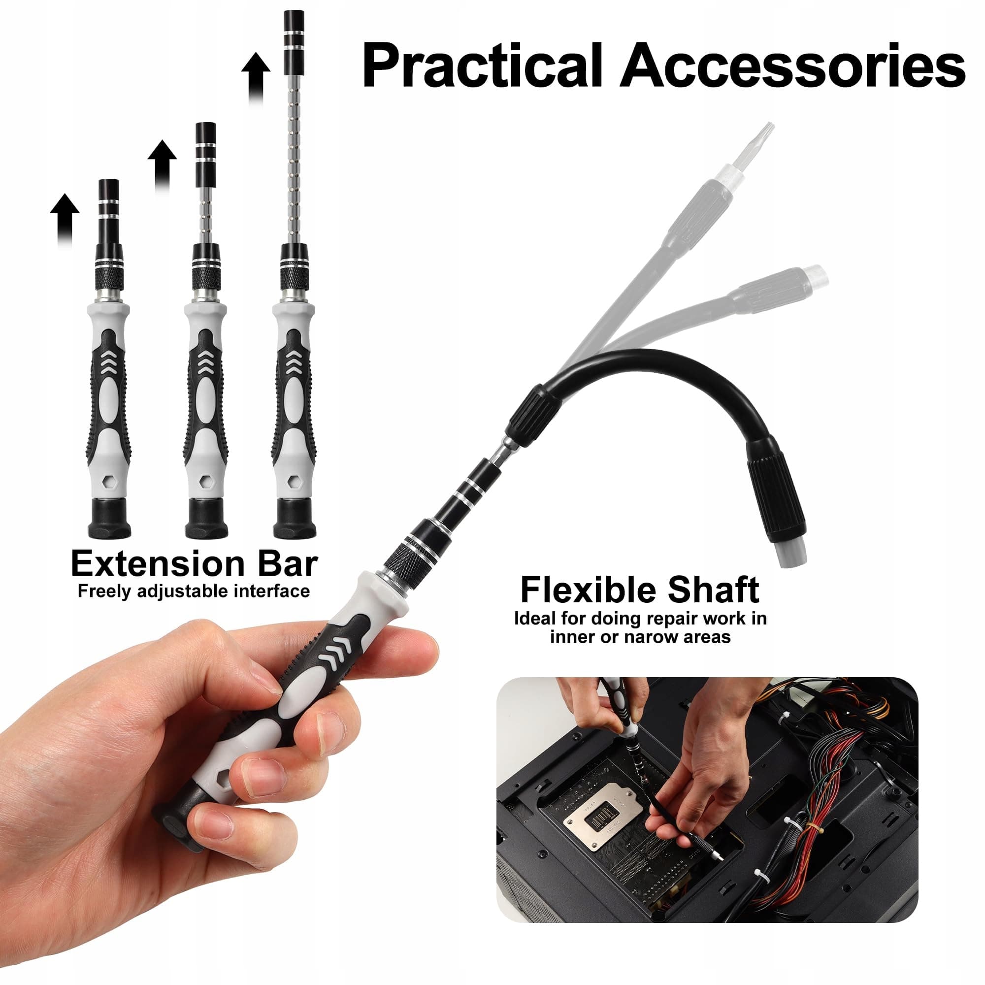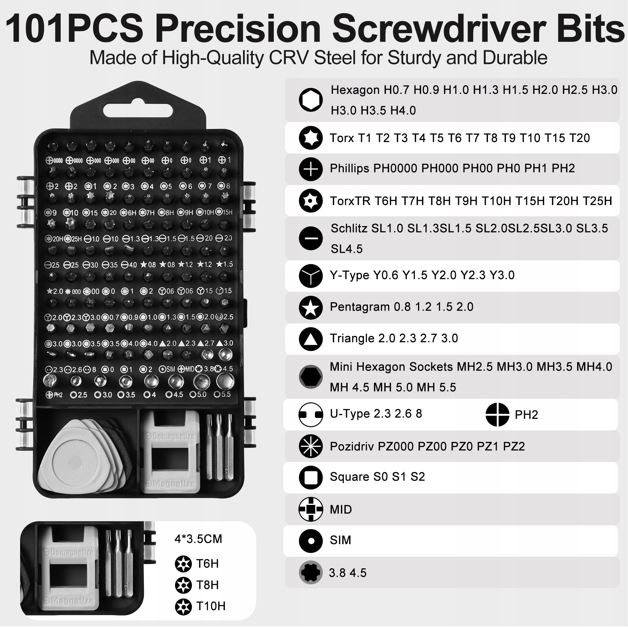 Odpowiedni do wielu zastosowań: 122 w 1 zestaw wkrętaków precyzyjnych zawiera 101 końcówek wkrętaków i 21 narzędzi pomocniczych, takich jak uchwyt wkrętaka, elastyczna oś, przedłużacz, magnes, podkładka magnetyczna itp. Zestaw ułatwia wymianę baterii, ekranów i innych komponentów w telefonach komórkowych i komputerach w domu, modernizację dysków twardych i wydajności komputerów oraz demontaż i naprawę urządzeń takich jak PS4, Xbox i kamery zegarkowe.
