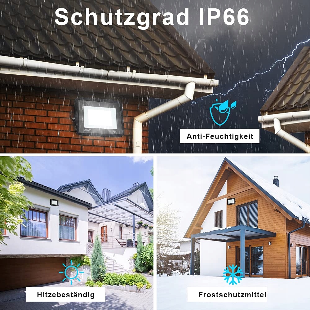 【Wodoodporność IP66】 Reflektory LED na zewnątrz wykonane są z odlewanego ciśnieniowo aluminium i wyposażone w wbudowaną uszczelkę silikonową, aby były wodoodporne i pyłoszczelne. Są całkowicie chronione przed wnikaniem kurzu i silnym strumieniem wody oraz oferują doskonałą ochronę przed rdzą dzięki powierzchniowej obróbce o wysokiej elektrostatycznej przyczepności. Nadają się do użytku na zewnątrz.