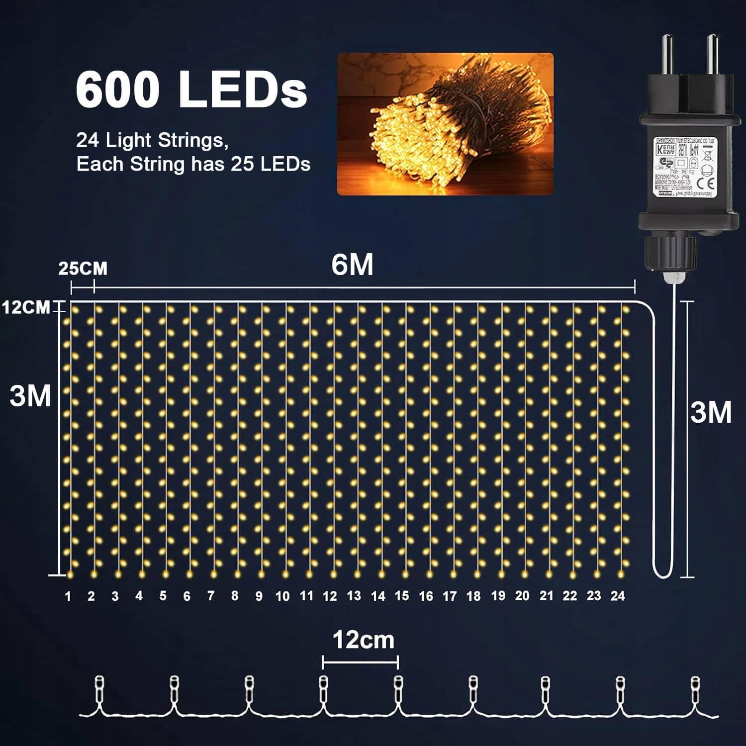 6m * 3m 600 LED kurtyna świetlna - Zasilane prądem świąteczne światła okienne mają 600 wysokiej jakości diod LED, bardziej żywe i piękniejsze niż inne podobne łańcuchy świetlne zasilane przez USB, które mają tylko 300 diod LED. Światło wodospadowe ma szerokość 6m i wysokość 3m, co wystarcza do pokrycia większości okien i ścian.