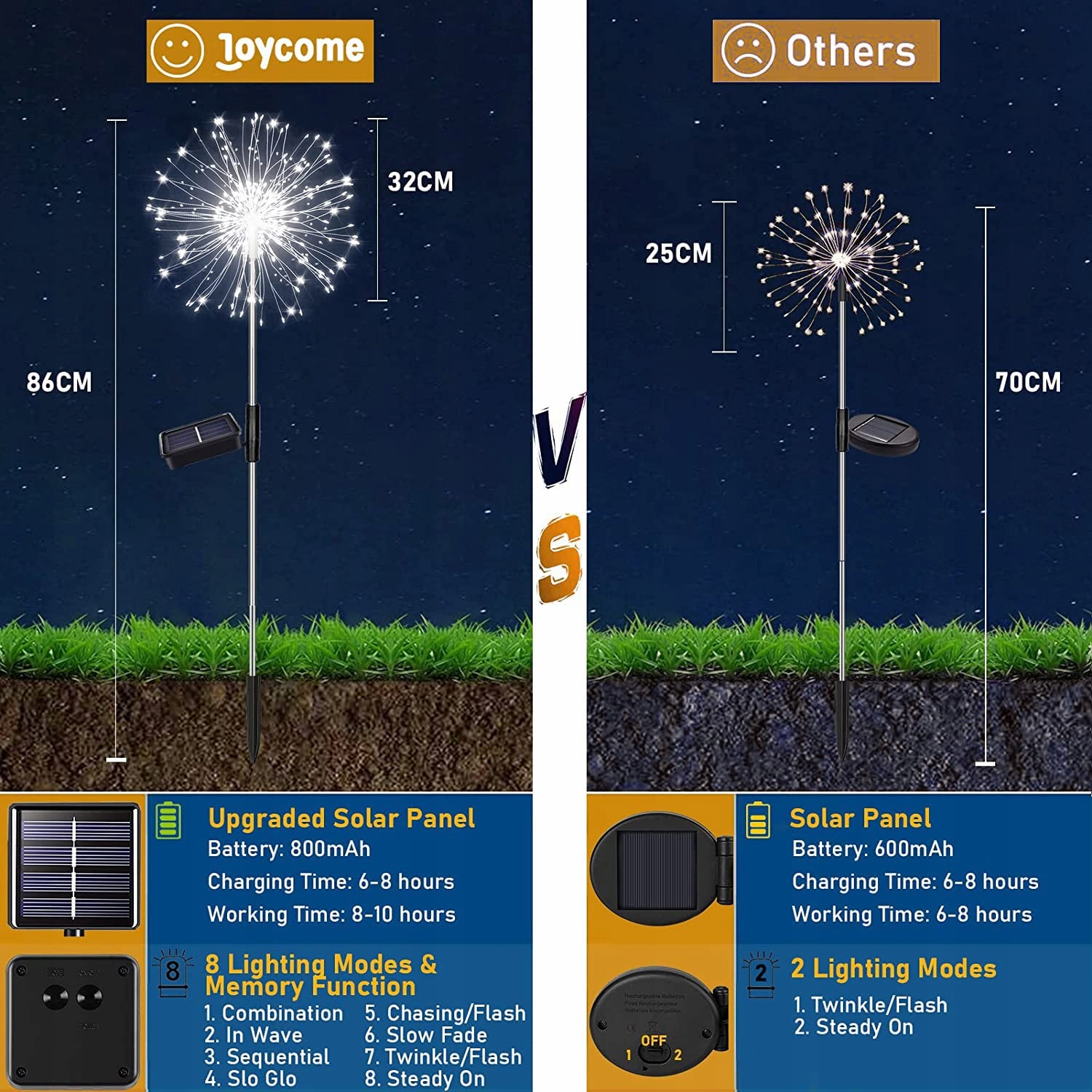 8 trybów i funkcja pamięci - Lampa solarna do ogrodu posiada 8 trybów migania, możesz dostosować styl swojej imprezy, zmieniając tryb za pomocą przycisku na panelu solarnym. Wbudowany chip pamięci zapisuje Twoje ostatnie ustawienie trybu, dzięki czemu nie musisz codziennie ustawiać trybu na nowo.