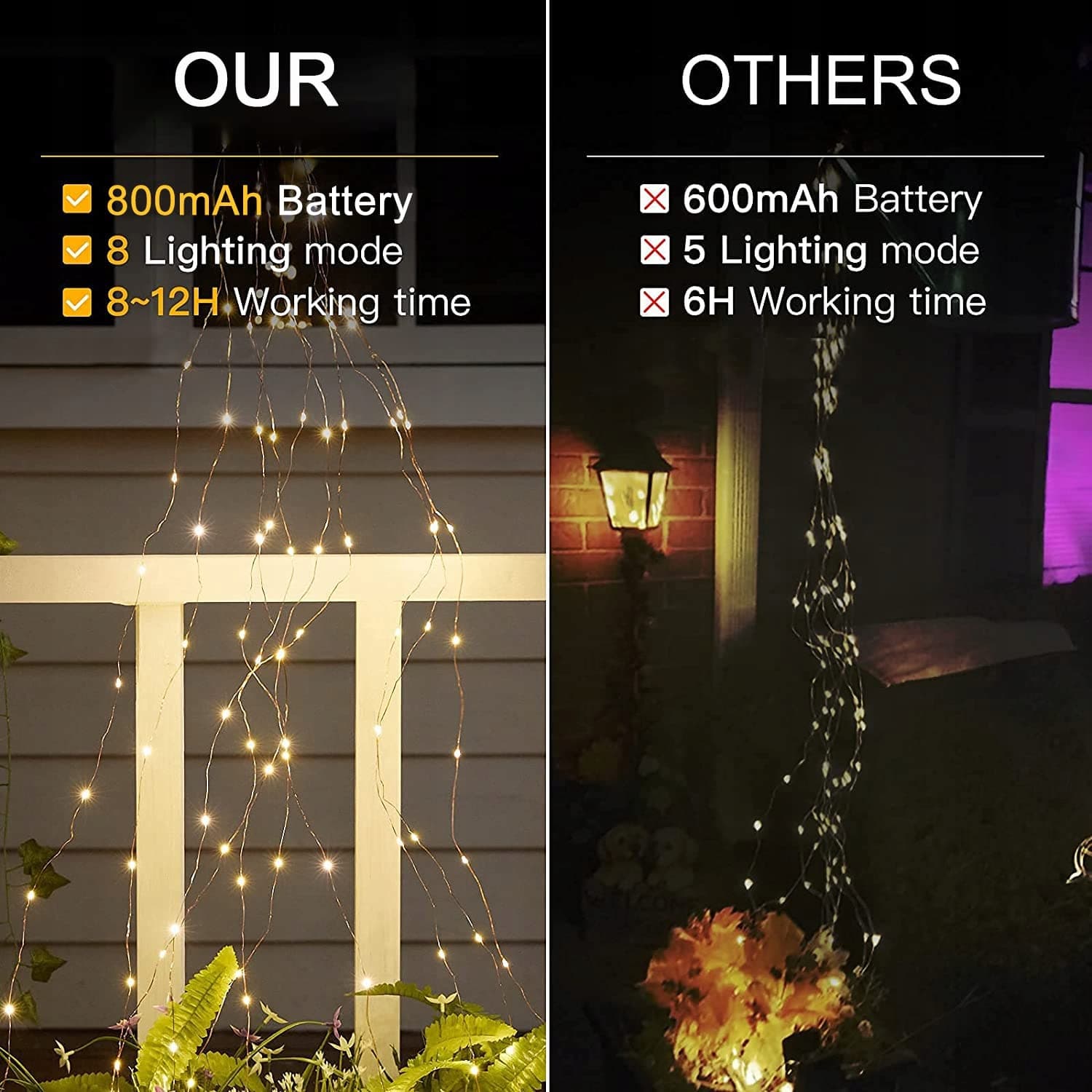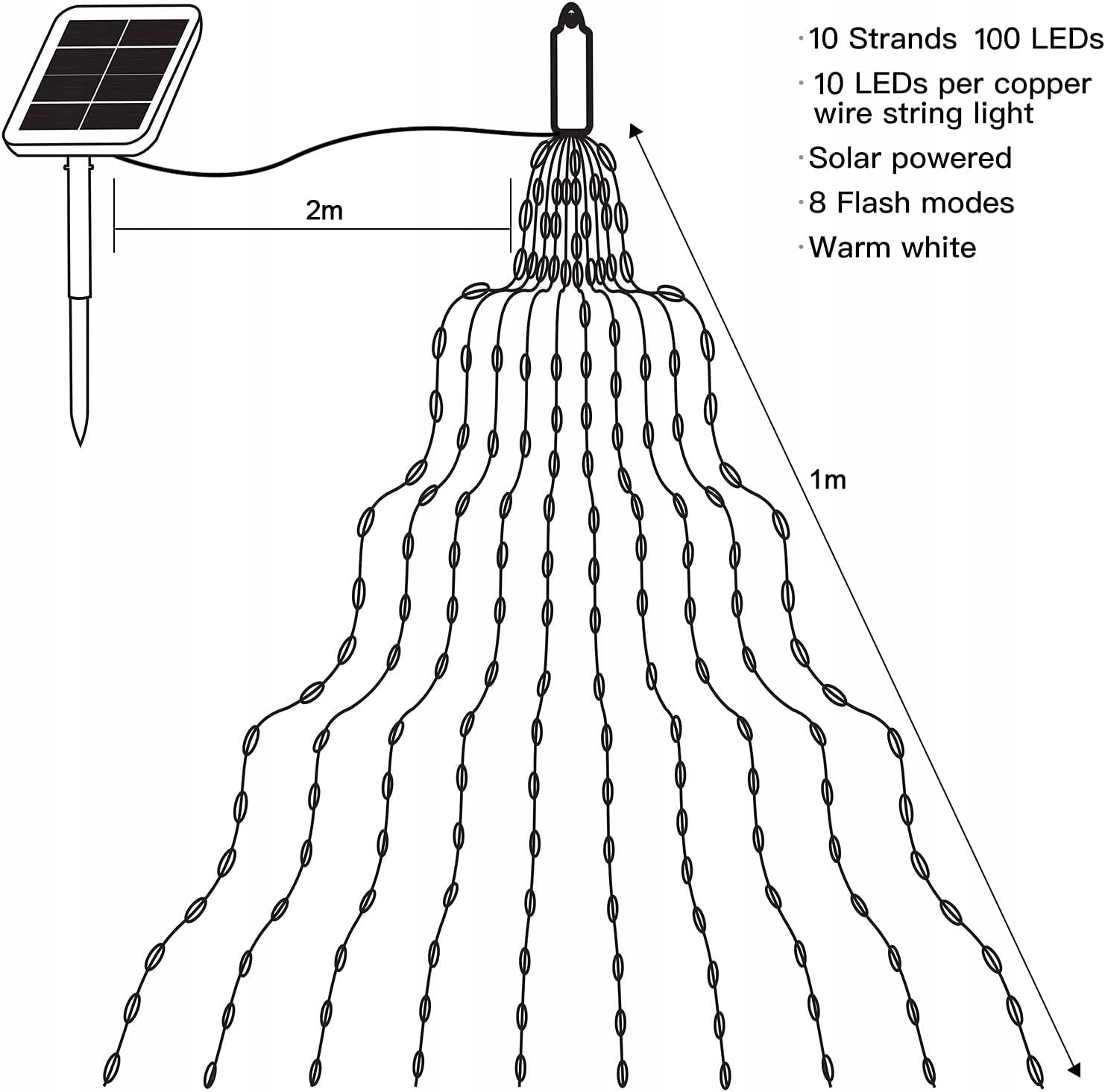 Solar Lichterbündel - Składa się z 10 elastycznych, 1-metrowych miedzianych drutów z 10 diodami LED na każdy drut, czyli łącznie 100 diod LED. Gdy światło miga, powstaje efekt przyciągającego wzrok wodospadu, który sprawia, że Twoja dekoracja ogrodu wyróżnia się. Idealna do dekoracji konewek, choinek i kwiatów, doskonały prezent dla rodziny, przyjaciół, kolegów lub dla siebie