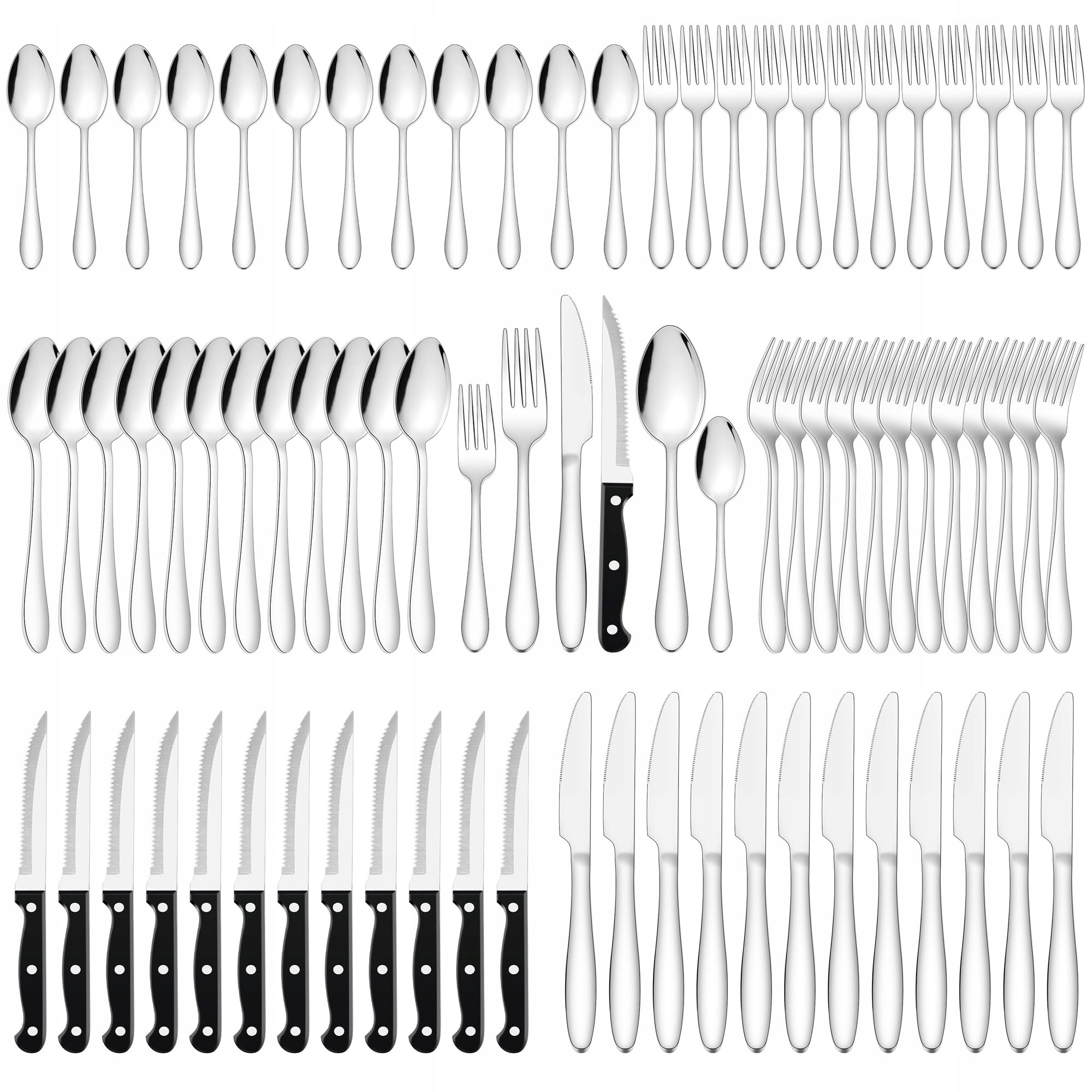 【Wysokiej jakości zestaw sztućców dla 12 osób】Sztućce Joyfair zawierają 12 noży do steków, 12 łyżek, 12 noży, 12 widelców, 12 łyżeczek, 12 widelczyków do sałatek, idealne na codzienne posiłki, rodzinne obiady i przyjmowanie gości, niezbędne narzędzie do jedzenia dla gospodarstw domowych i restauracji