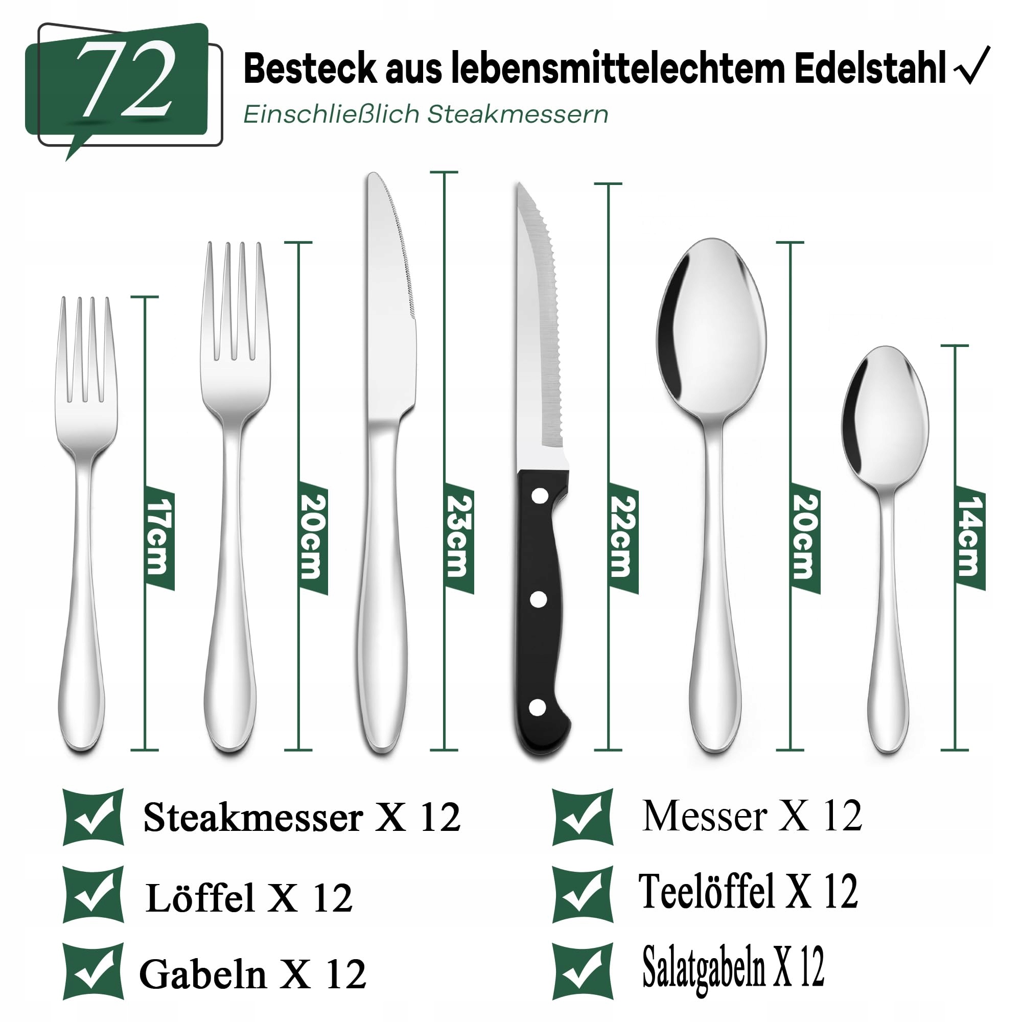 Zestaw sztućców, Joyfair 72-częściowy zestaw sztućców ze stali nierdzewnej z nożami do steków, zestaw sztućców dla 12 osób z widelcami, nożami, łyżkami, elegancki zestaw sztućców stołowych dla rodziny/restauracji/bistro/imprezy, nadaje się do mycia w zmywarce