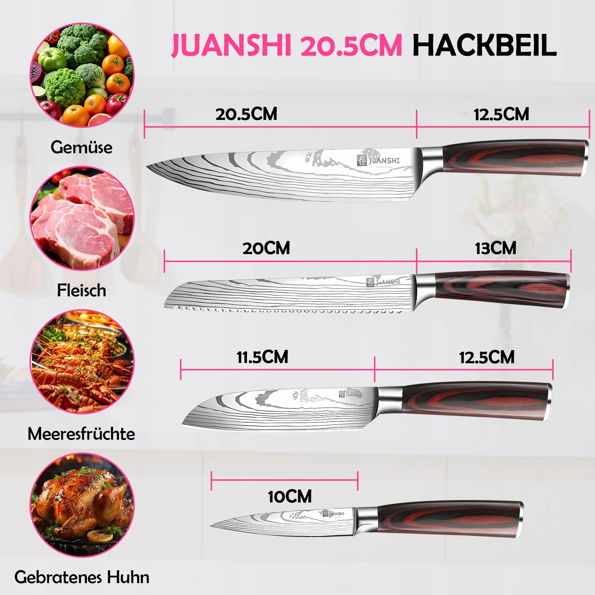 JUANSHI® 4-częściowy zestaw noży – profesjonalny zestaw noży kuchennych z wysokiej jakości stali nierdzewnej, ostre ostrza, w tym Santoku, nóż szefa kuchni, nóż do chleba i nóż uniwersalny