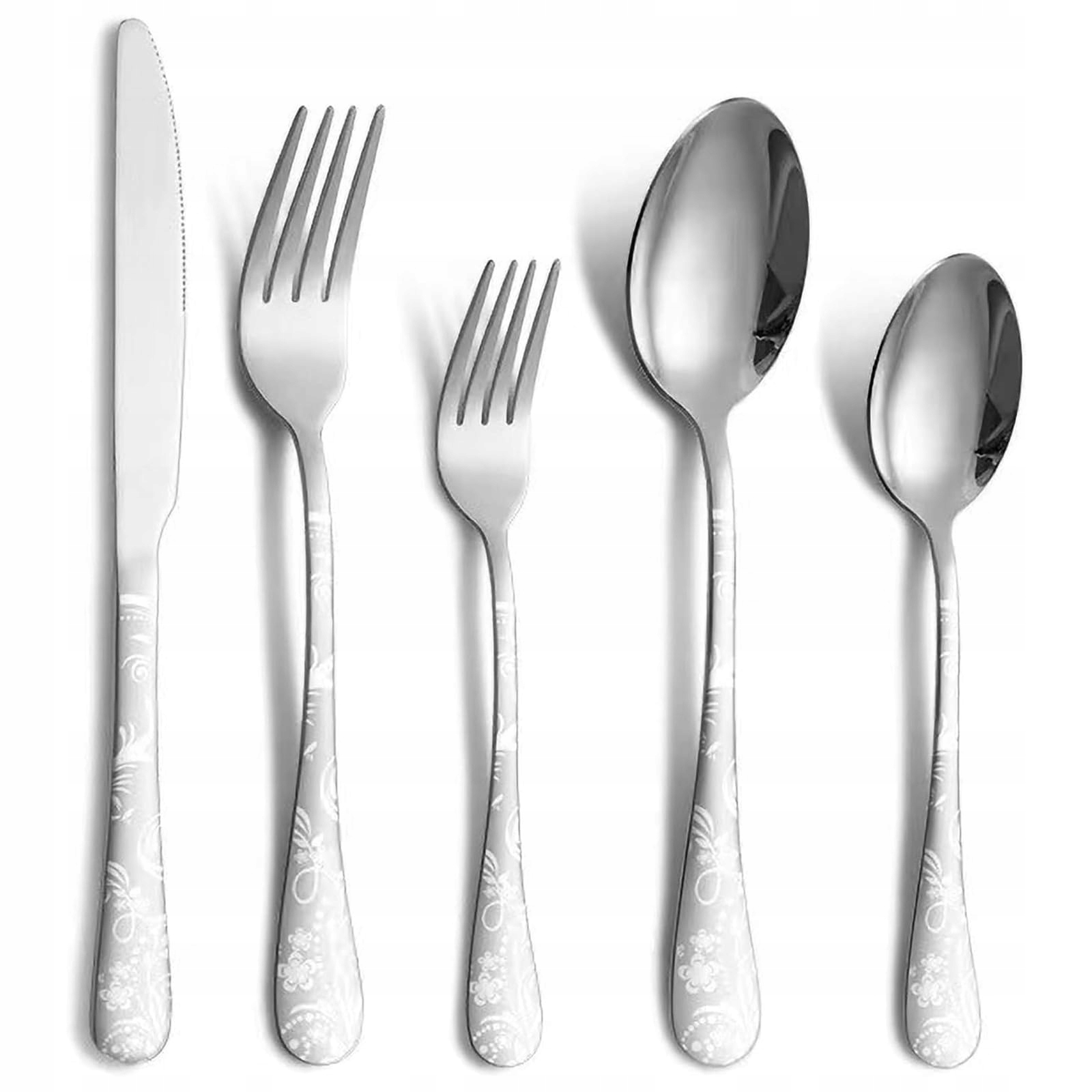 Wysokiej jakości materiał: Ten zestaw sztućców ze stali nierdzewnej wykonany jest z bezpiecznej dla żywności stali nierdzewnej, co zapewnia bezpieczeństwo i trwałość. Jest odporny na rdzę i korozję, można go używać przez długi czas bez korozji lub uszkodzeń. Zestaw sztućców dla 4 osób (20 elementów): 4 widelce, noże stołowe, łyżki, widelczyki do ciasta, łyżeczki do herbaty