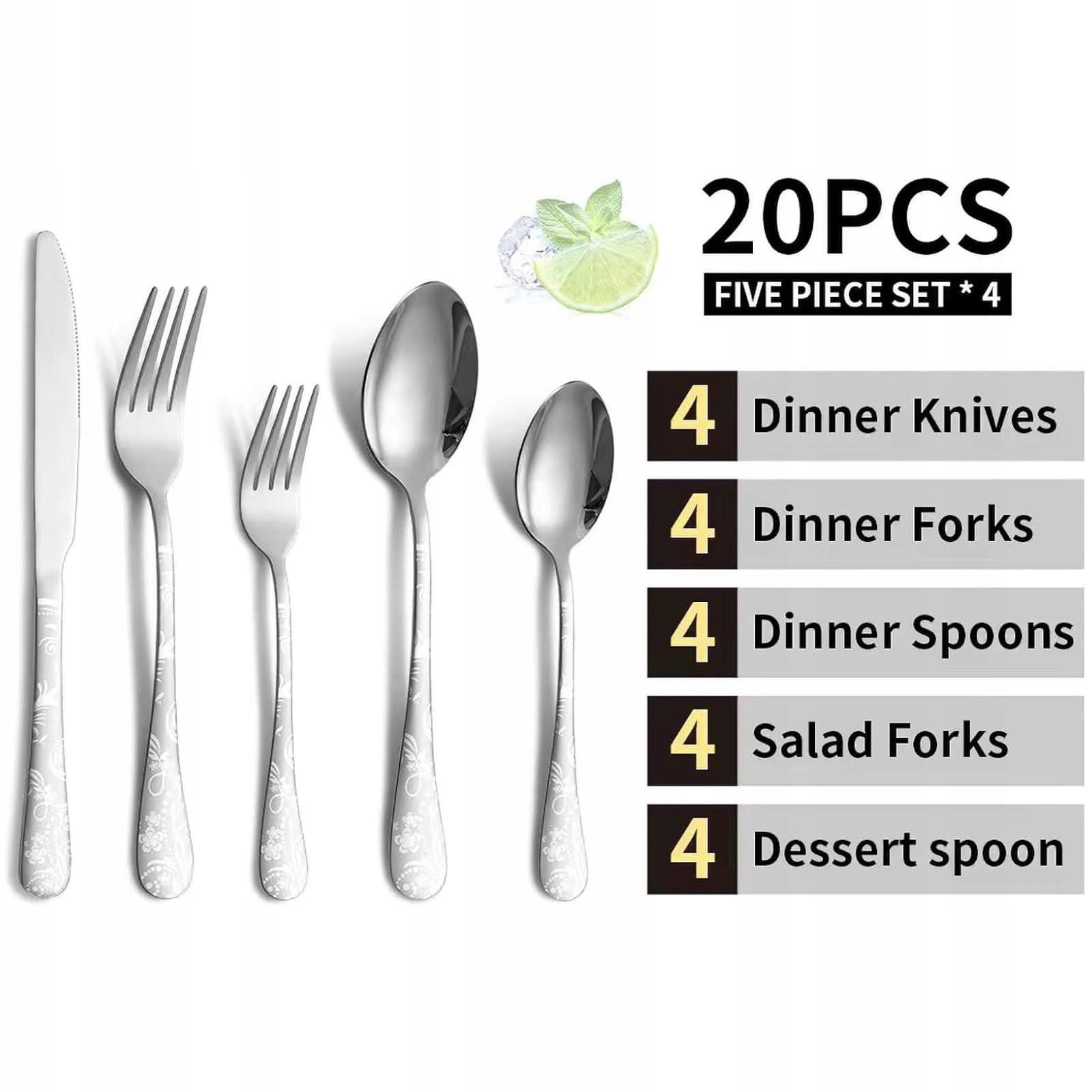 Zestaw sztućców Jxkgenix, zestaw sztućców dla 4 osób, 20 elementów, nóż, widelec, łyżka, wzór, sztućce ze stali nierdzewnej polerowane na lustro, nadające się do zmywarki (srebrny)