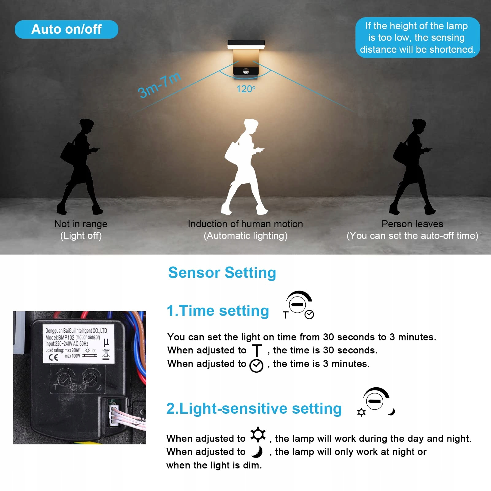 1. Inteligentna indukcja: Ta lampa naścienna LED wyposażona jest w czujnik światła i czujnik wykrywania ruchu, który może ręcznie ustawić tryb pracy dzień/noc. Gdy ktoś przejdzie w odległości 4 m, światło włącza się automatycznie i wyłącza po 30s do 180s (ręczna regulacja czasu) bez ręcznego przełączania, co oszczędza energię.