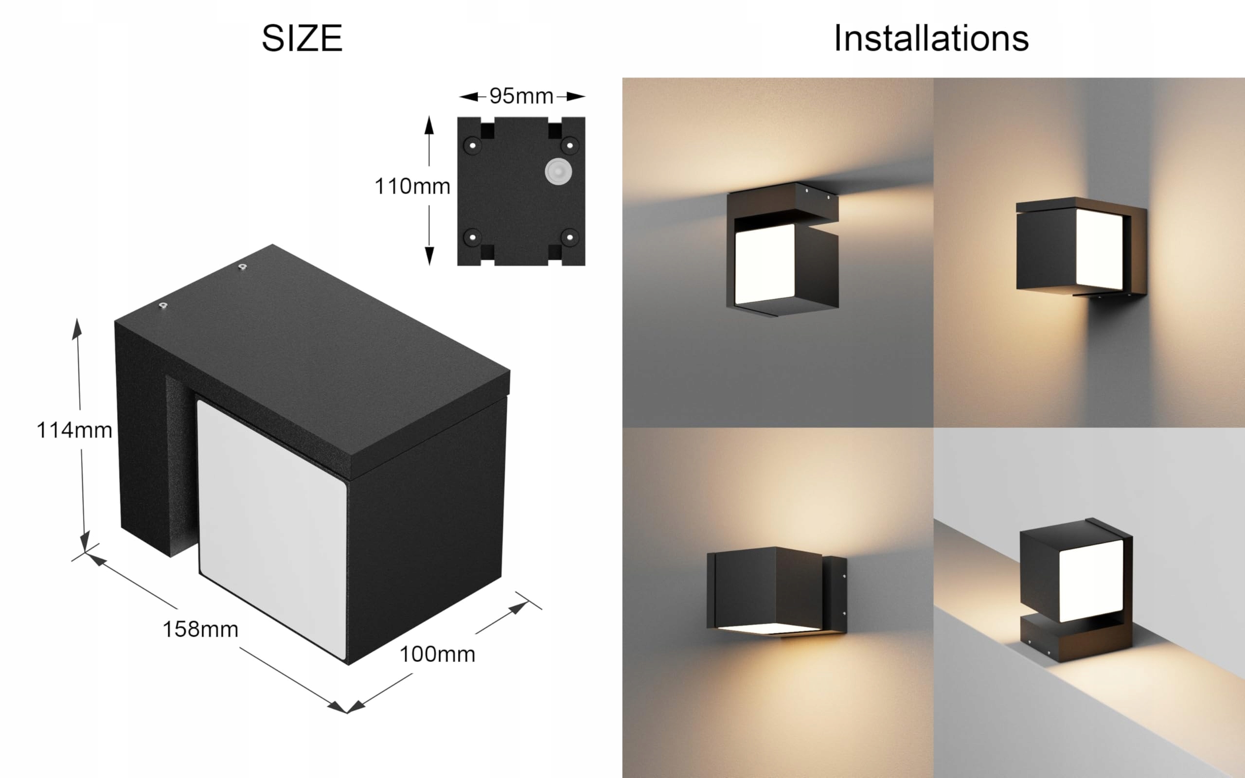 Parametry kinkietu). Materiał: aluminium + akryl; moc: 18W; jasność: 960 lumenów; napięcie: 110V-230V; stopień ochrony: IP54; wykończenie powierzchni: matowe piaskowane; instalacja: mocowanie na ścianie/suficie; możliwość regulacji jasności: nie.