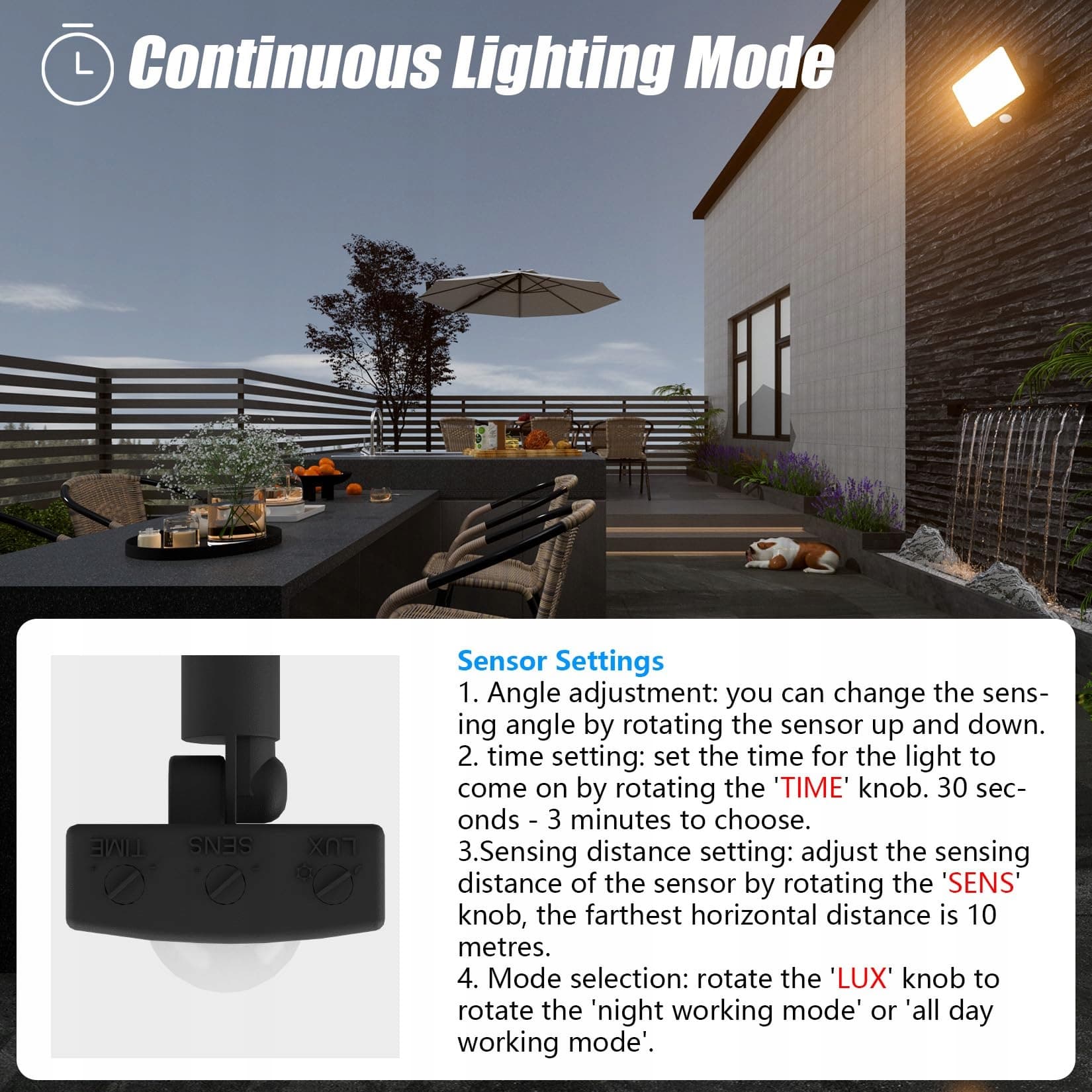 【Ustawienia czujnika】Czujniki reflektora LED K-Bright z czujnikiem ruchu można ustawić. Obracając pokrętło 'TIME', ustawia się czas świecenia (30 sekund - 3 minuty). Obracając pokrętło 'SENS', można ustawić zasięg wykrywania (5-10 metrów). Obracając ramię robota, można ustawić kąt wykrywania czujnika.